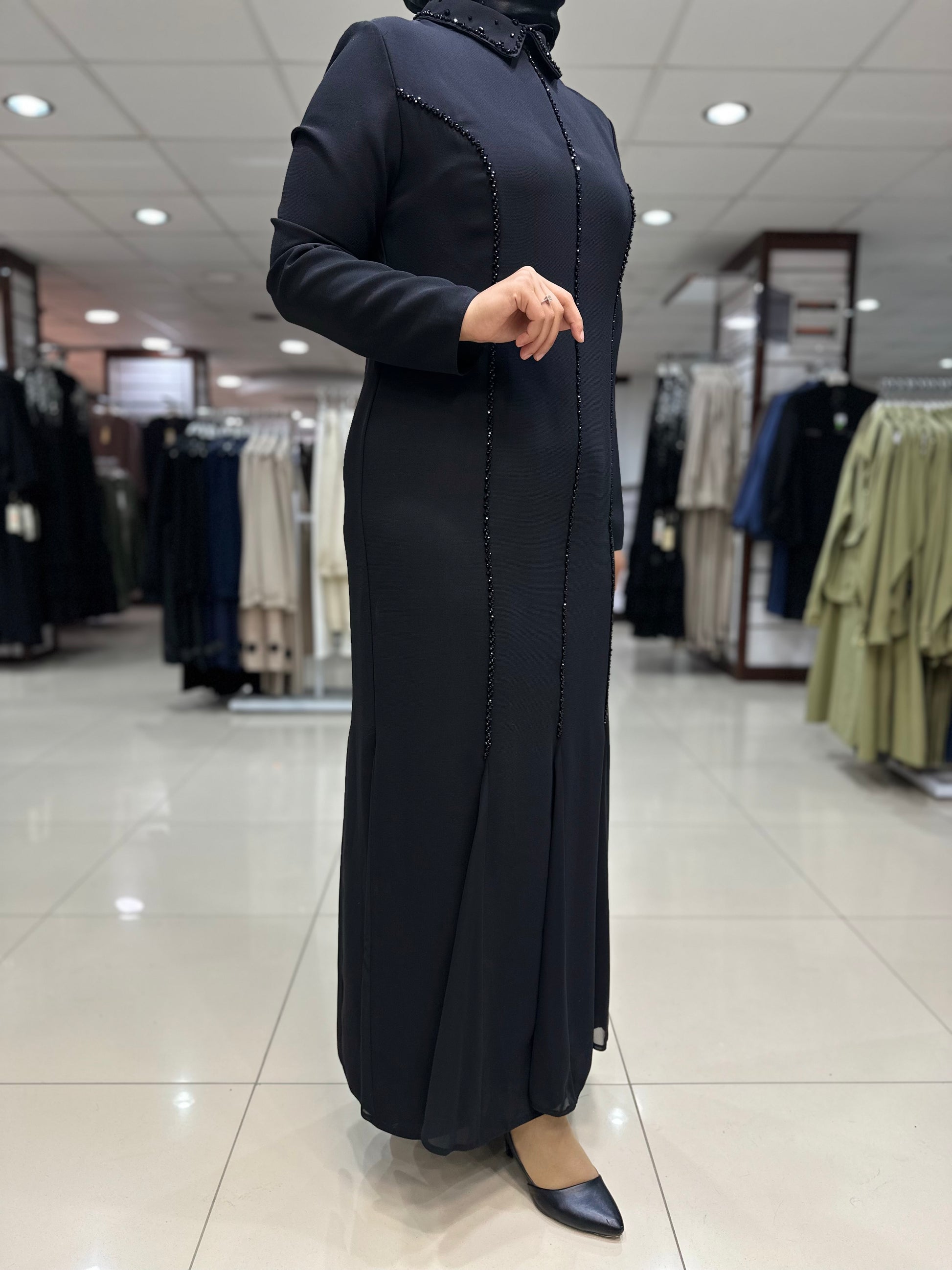 tam kalıp yakalı balık kesim yaka ve önünde boncuk işlemeli sırt yarım fermuar