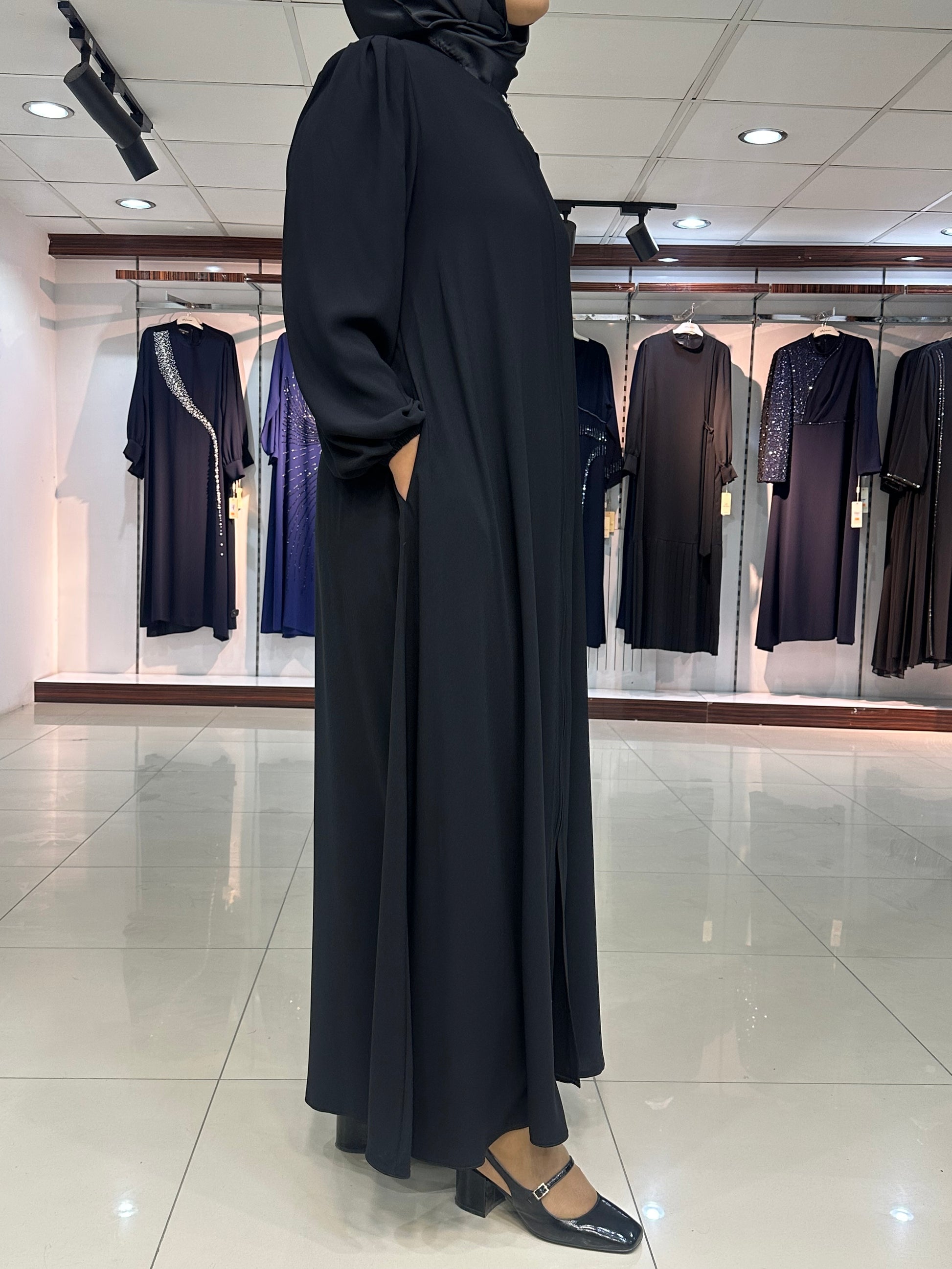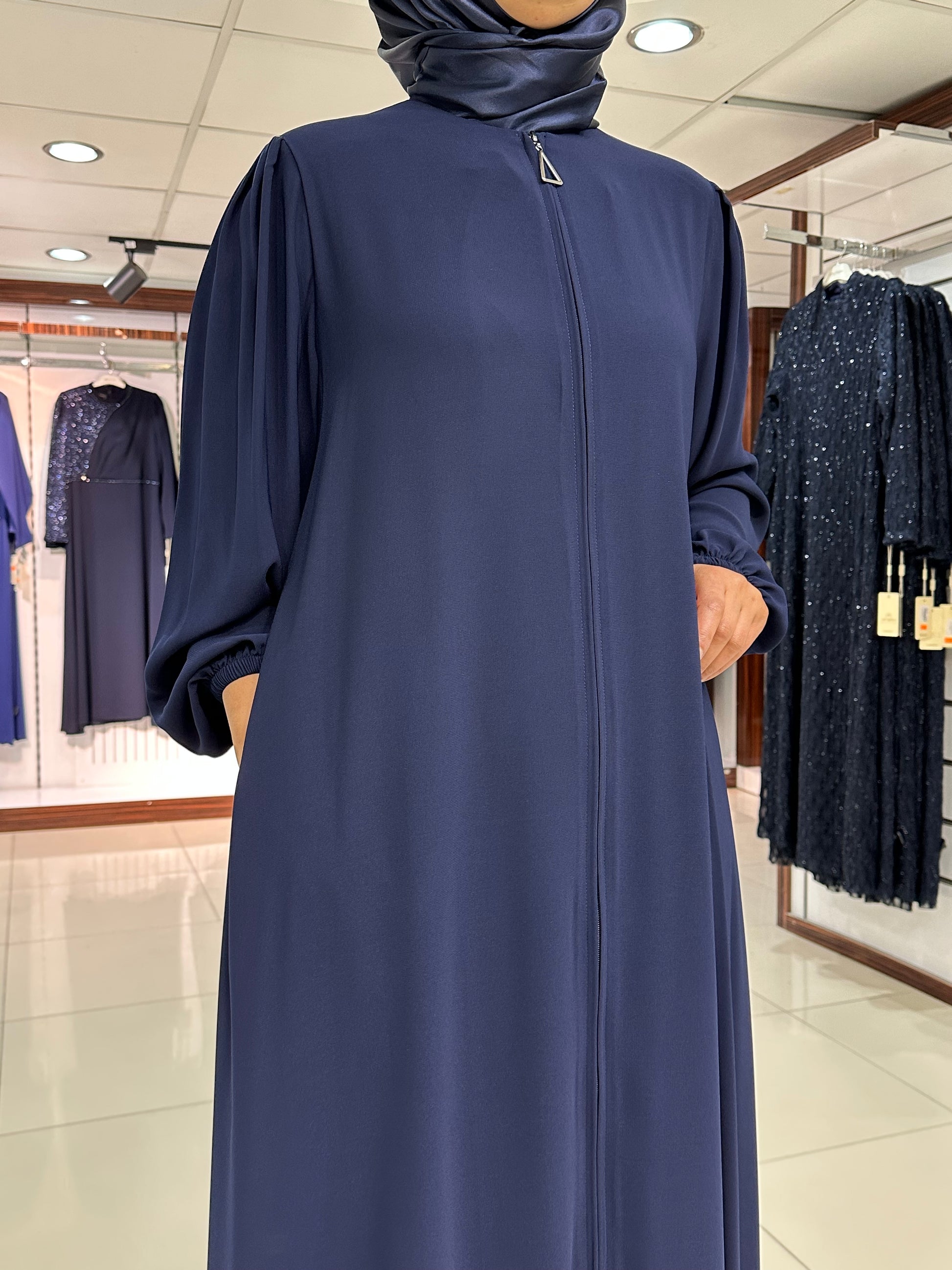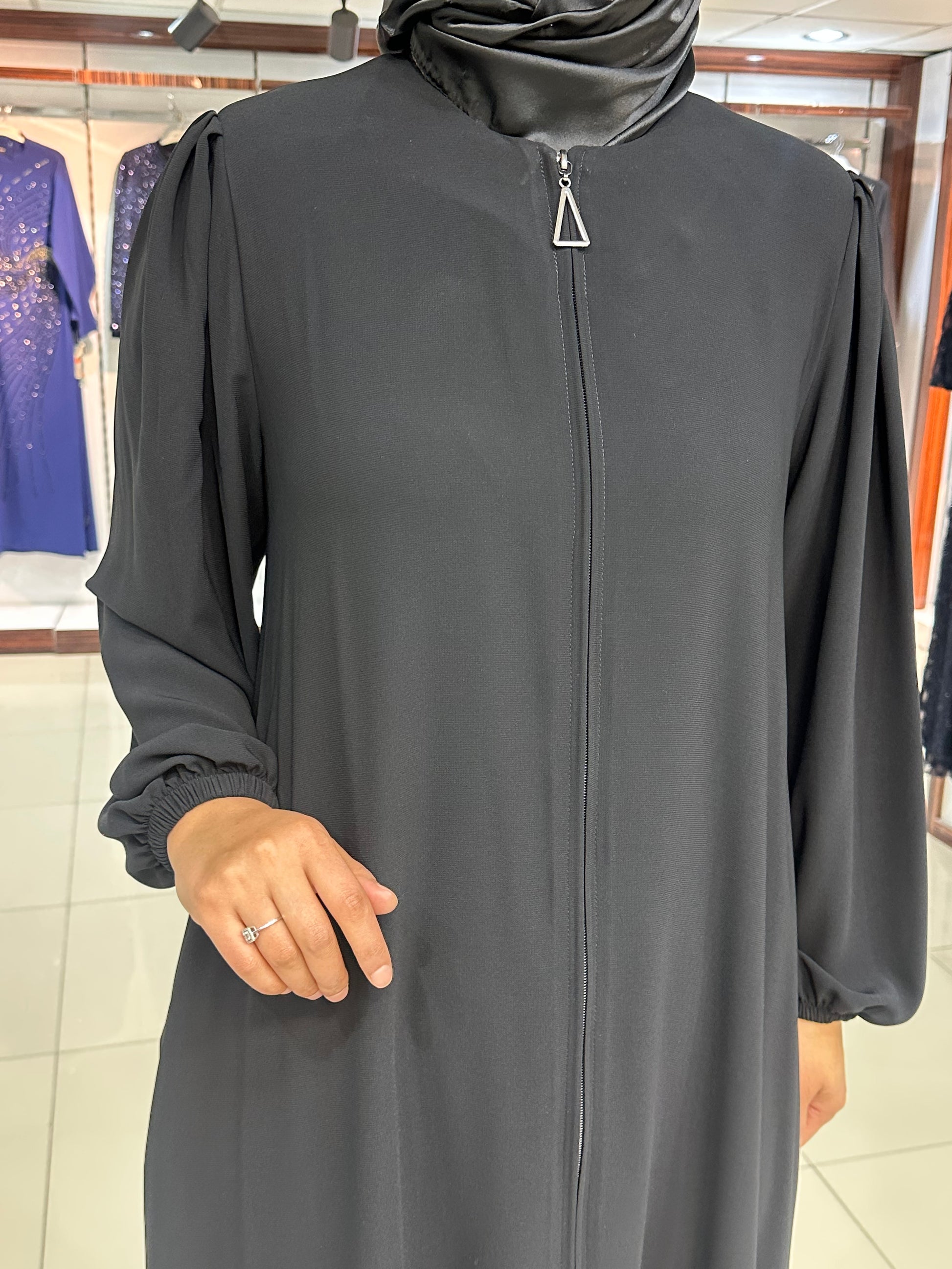 Omuzları pileli, kol ağızları lastikli, boydan fermuarlı, sıfır yaka, mevlana kesim, yandan cepli modelimizdir.