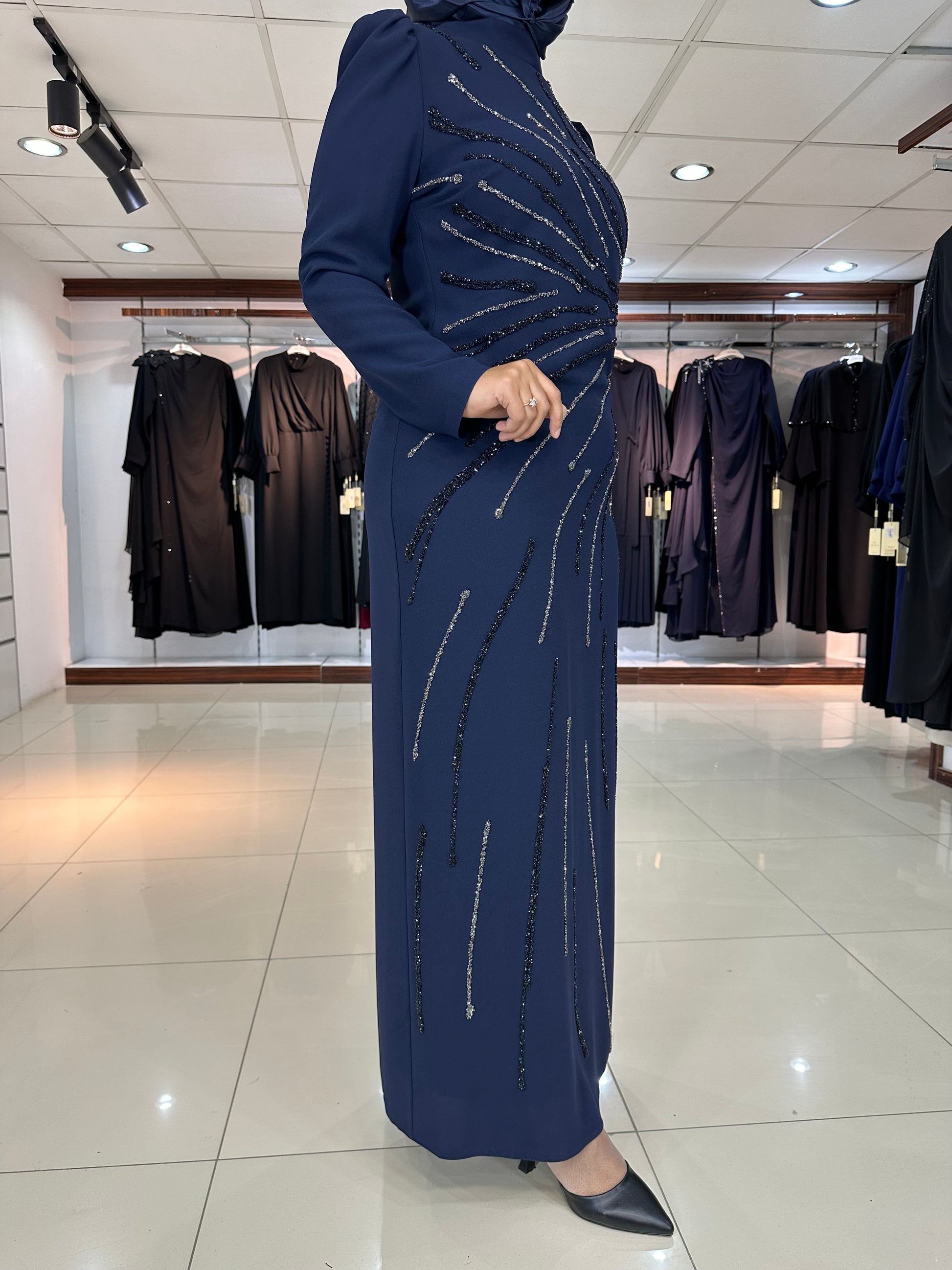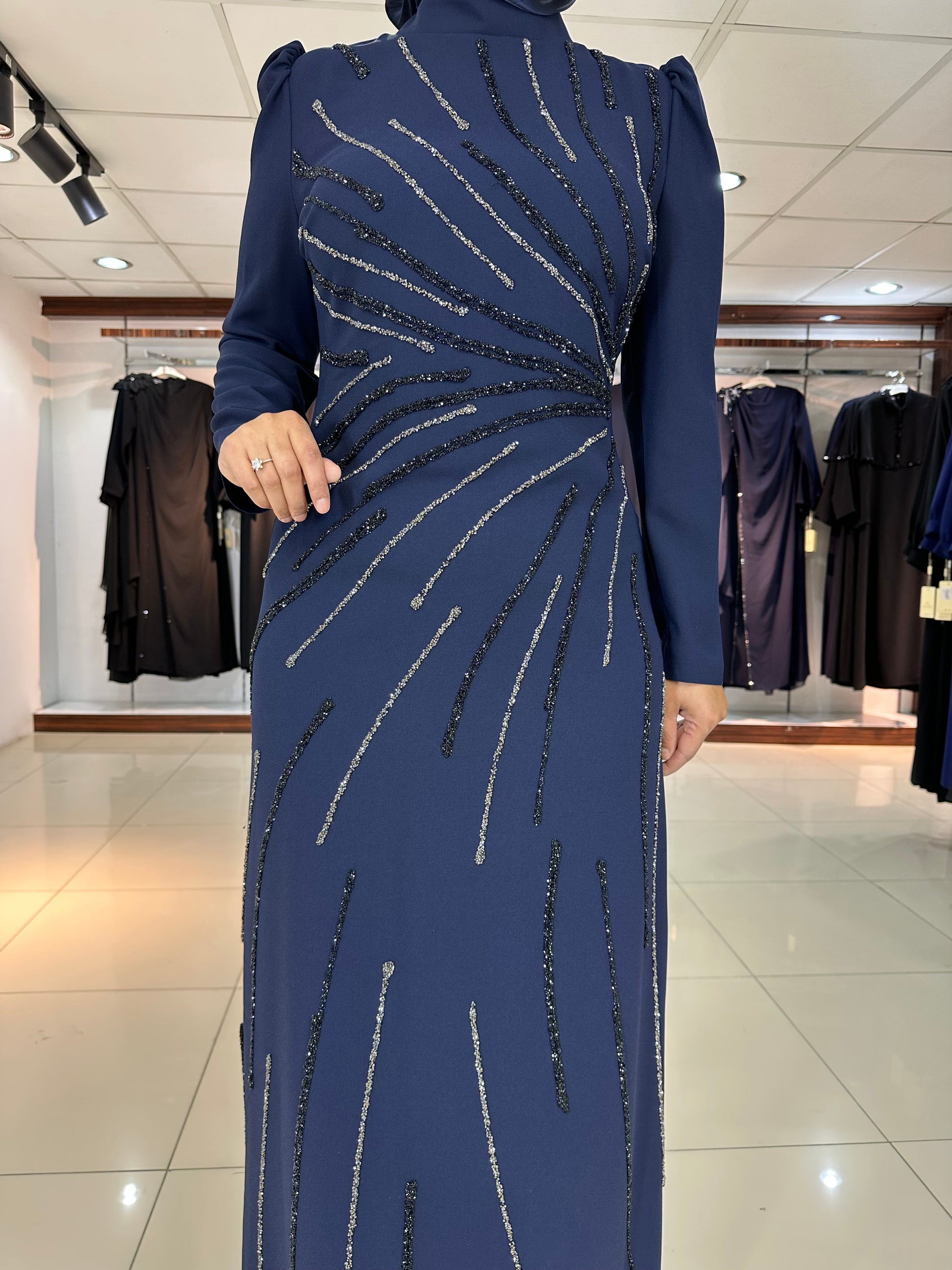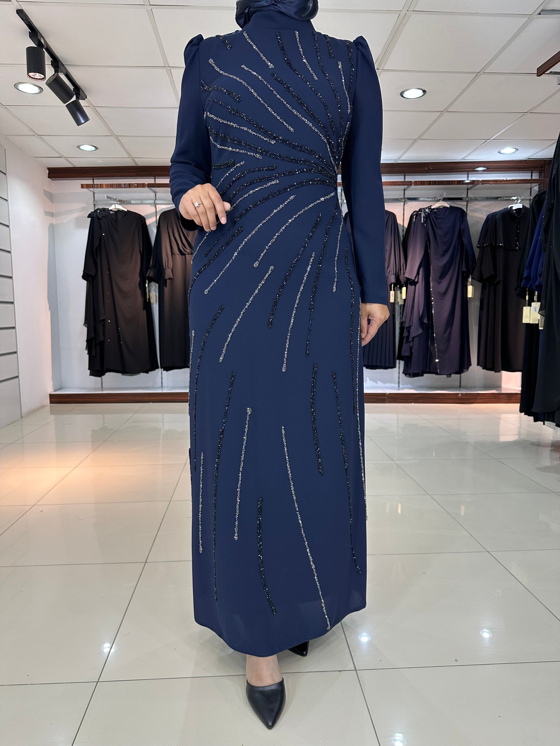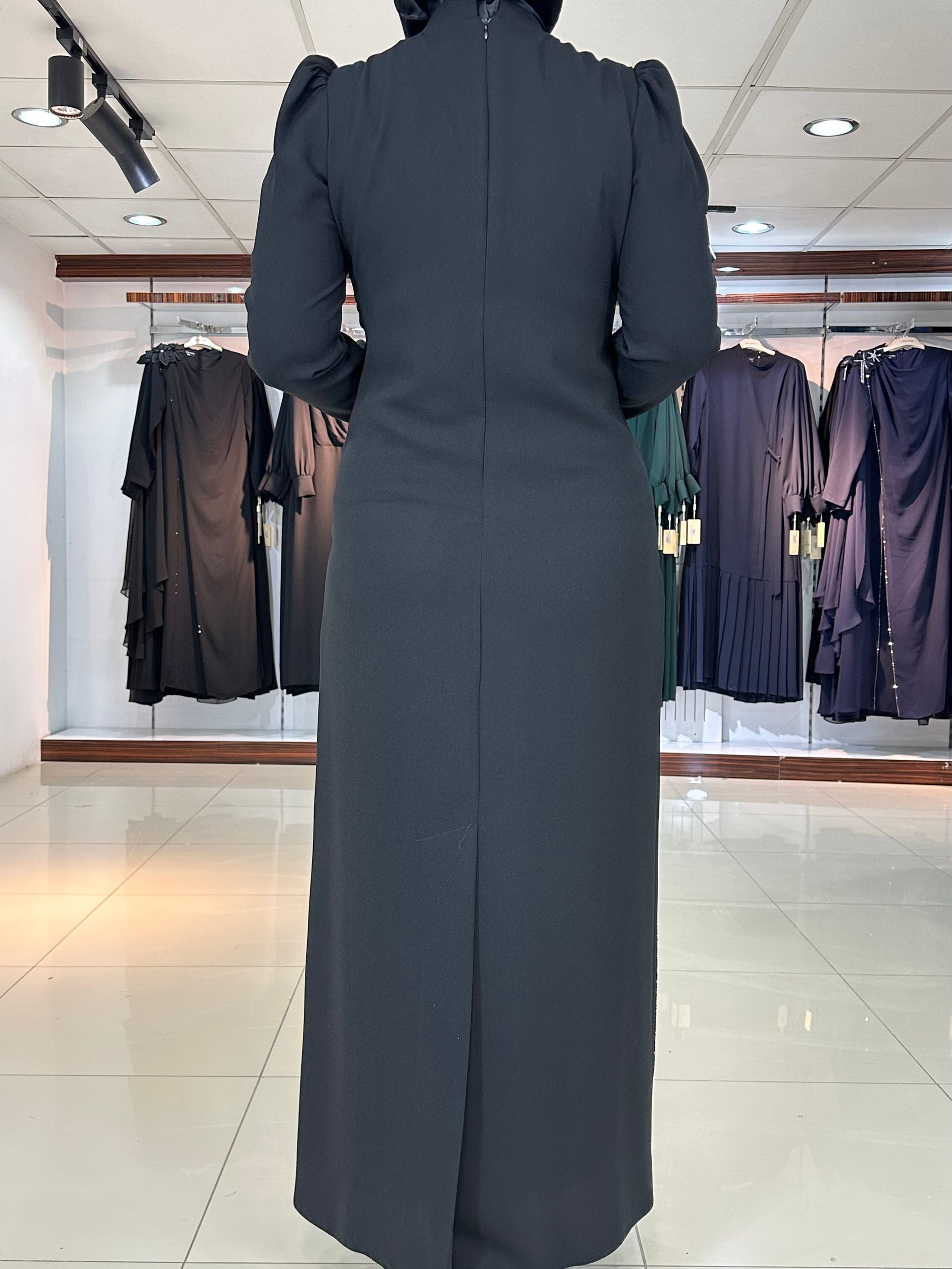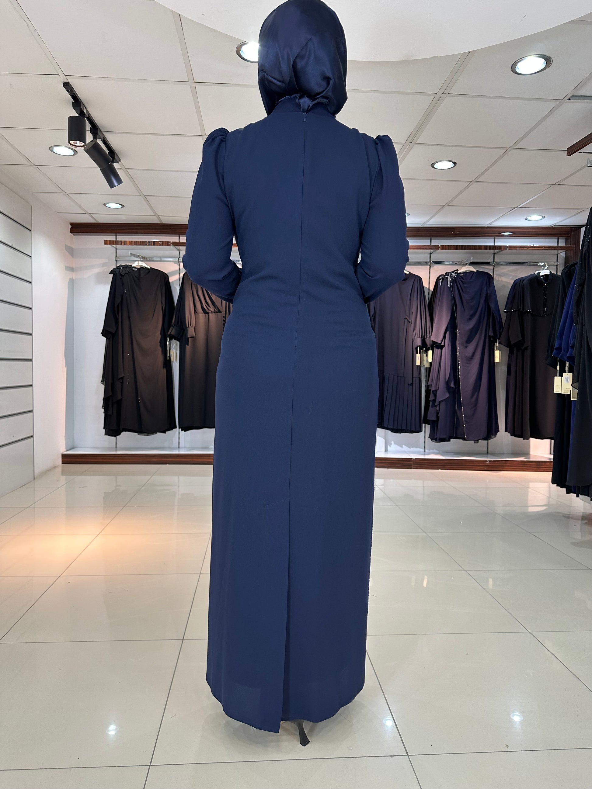 Düz kesim, tam kalıp. İşleme detayları zımbalı olup düşme yapmaz. Omuzlardan balon kol detayına sahiptir. Görünmez fermuarı ve tesettür için dik yakaya sahiptir. Modelimiz astarlıdır.