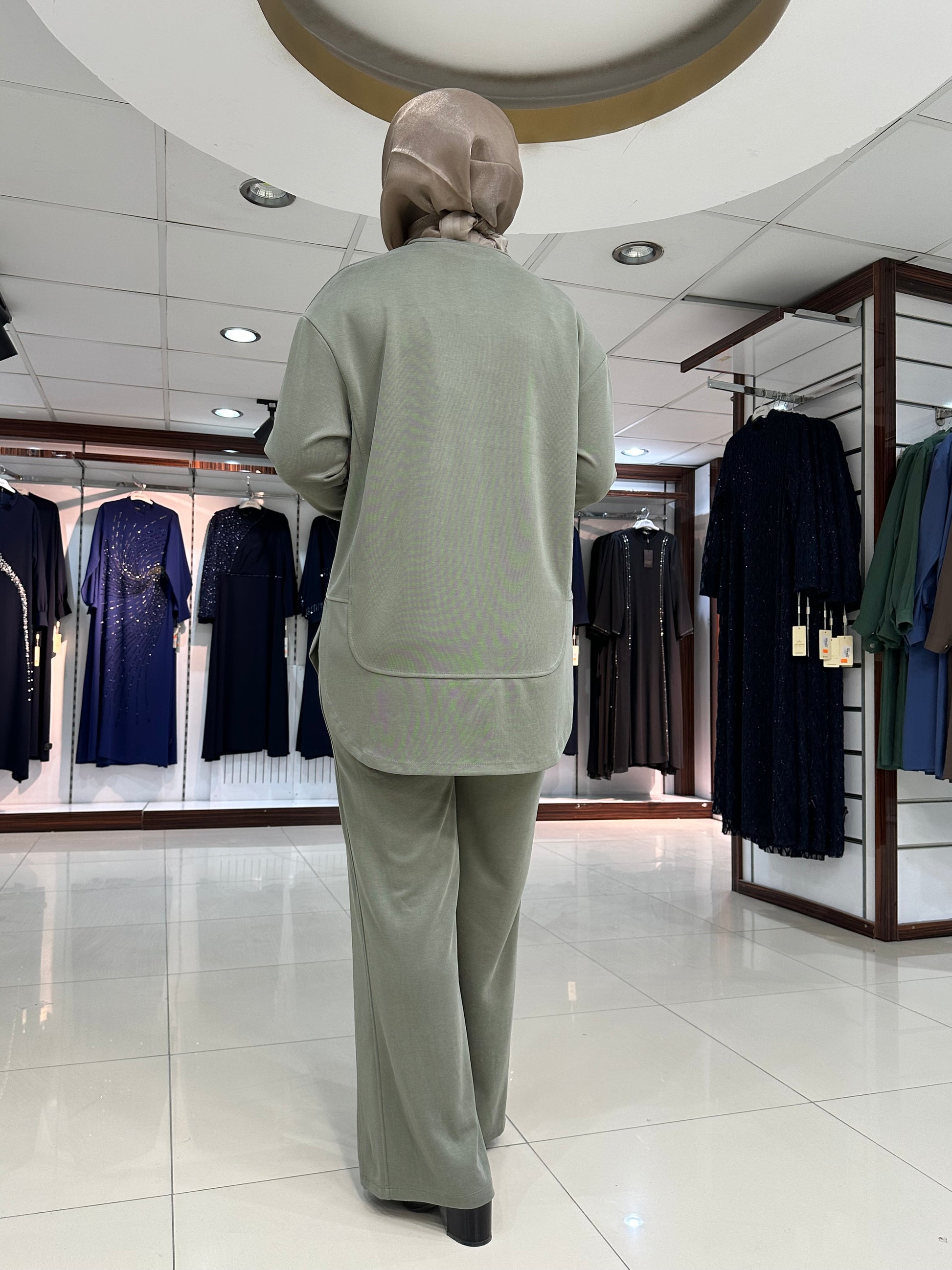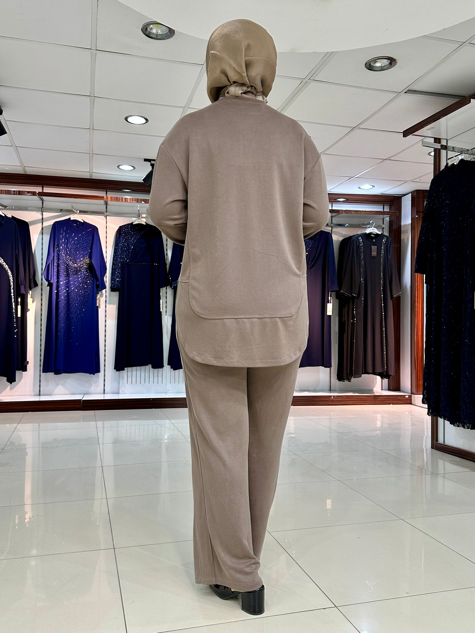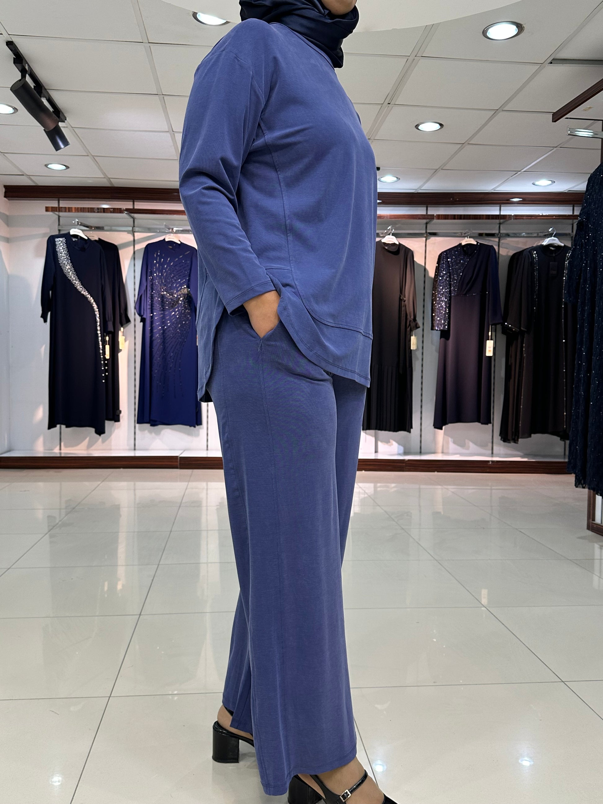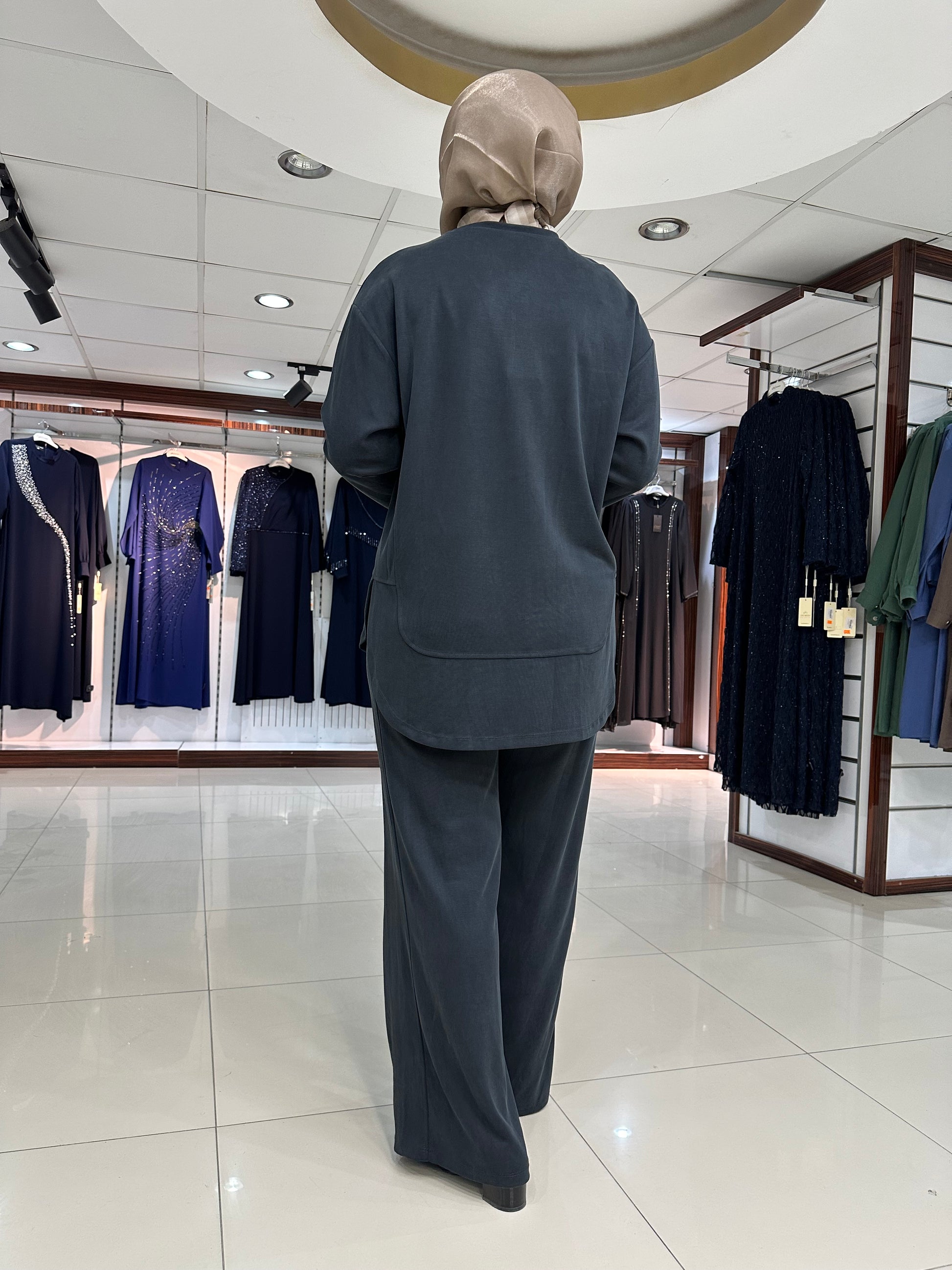 Reklam kol, yandan yırtmaçlı, rahat kalıp, sıfır yaka tunik ile pantolon bel lastikli ve bağcıklı, yandan cepli, rahat kalıp, bol paçalı modelimizdir.
