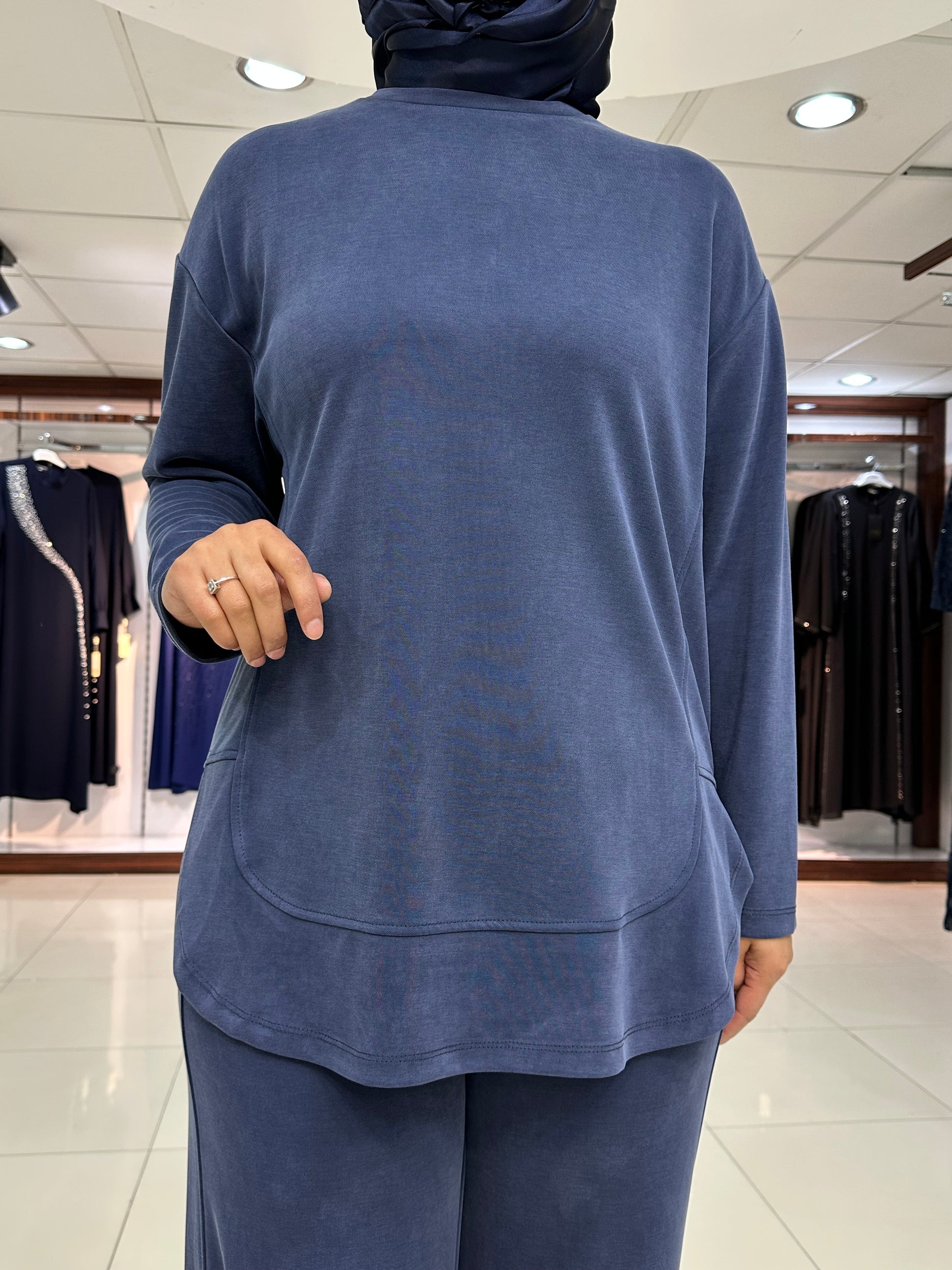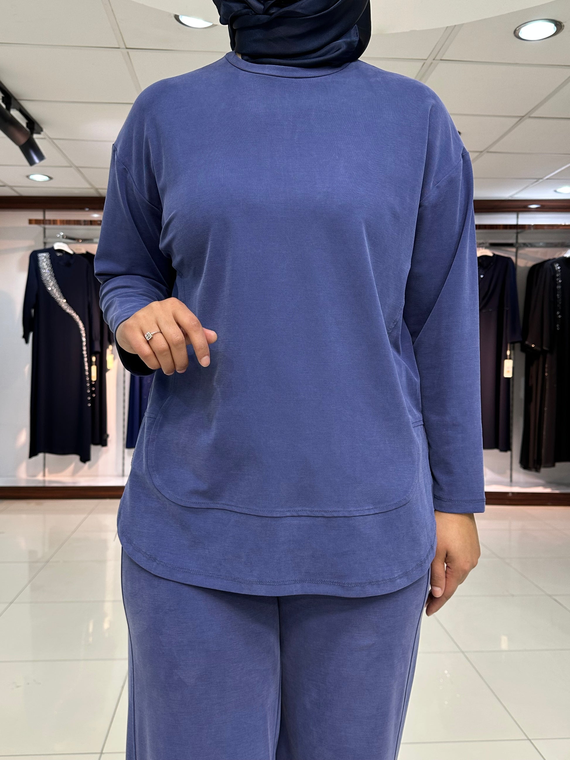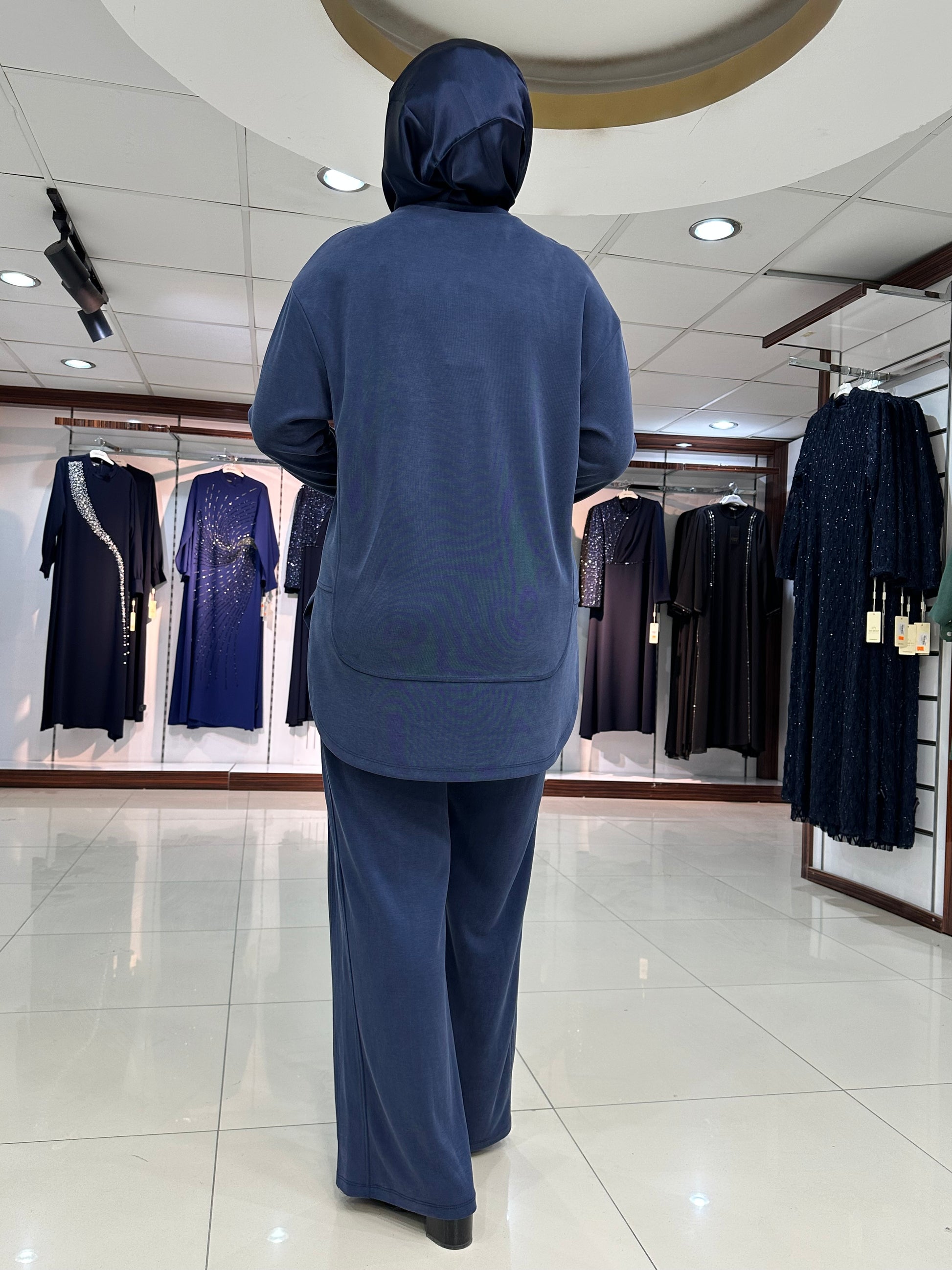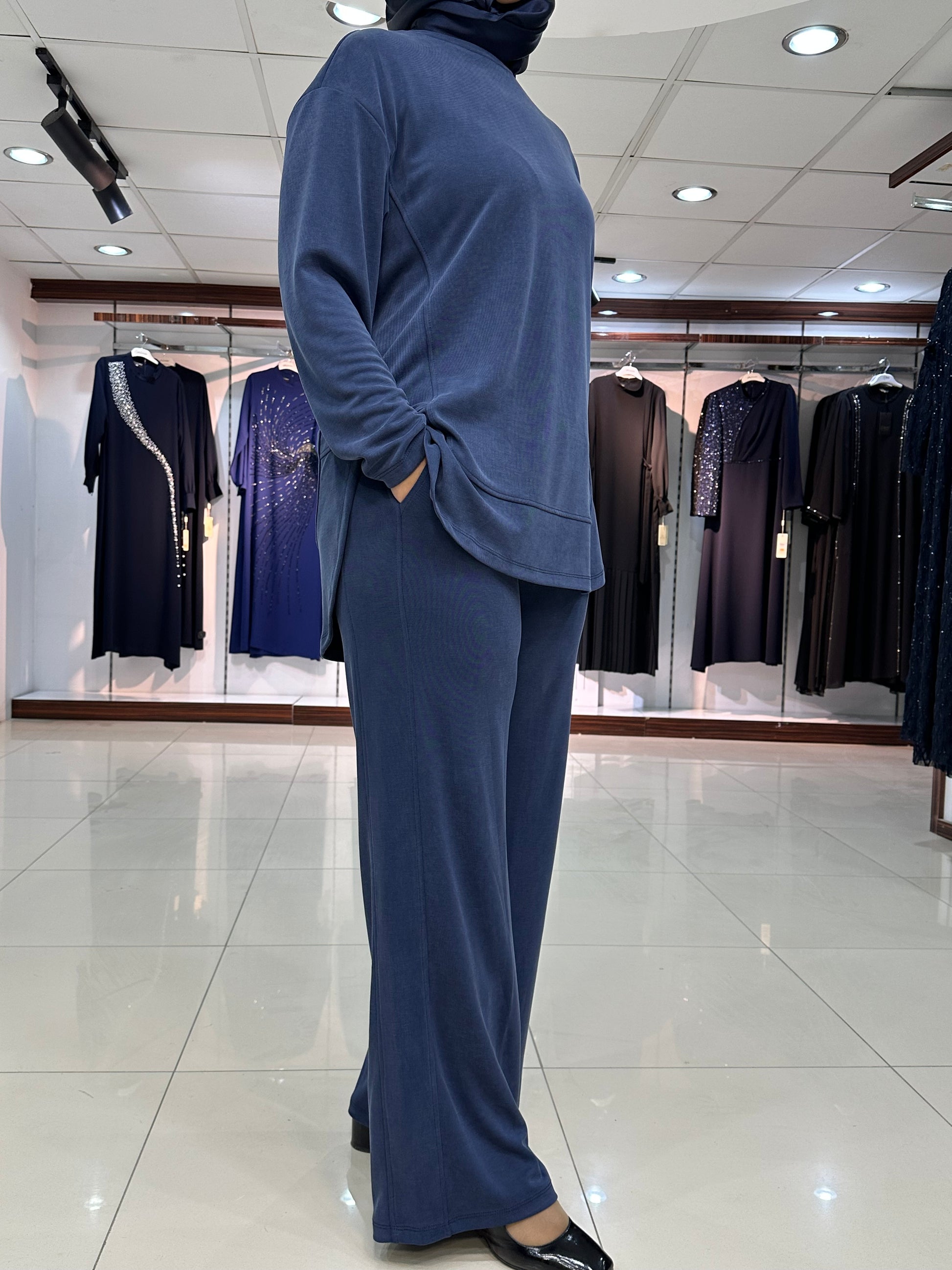 Reklam kol, yandan yırtmaçlı, rahat kalıp, sıfır yaka tunik ile pantolon bel lastikli ve bağcıklı, yandan cepli, rahat kalıp, bol paçalı modelimizdir.