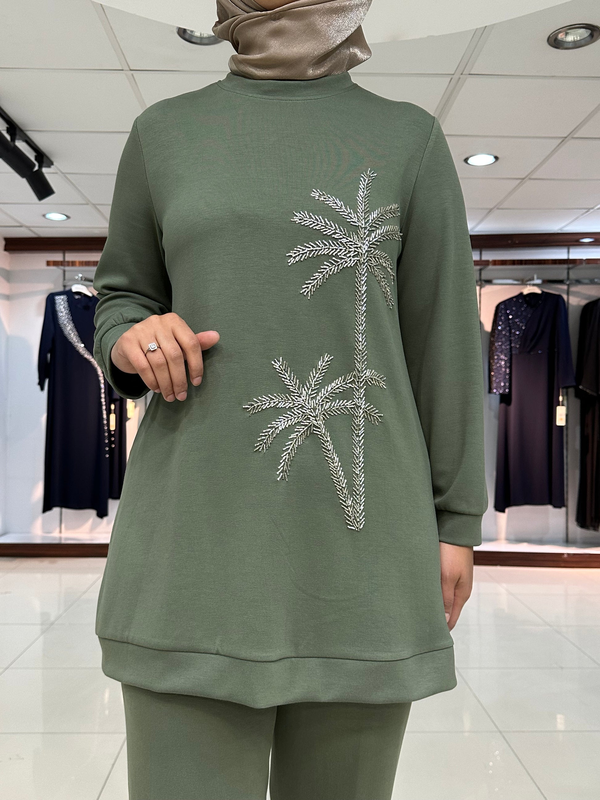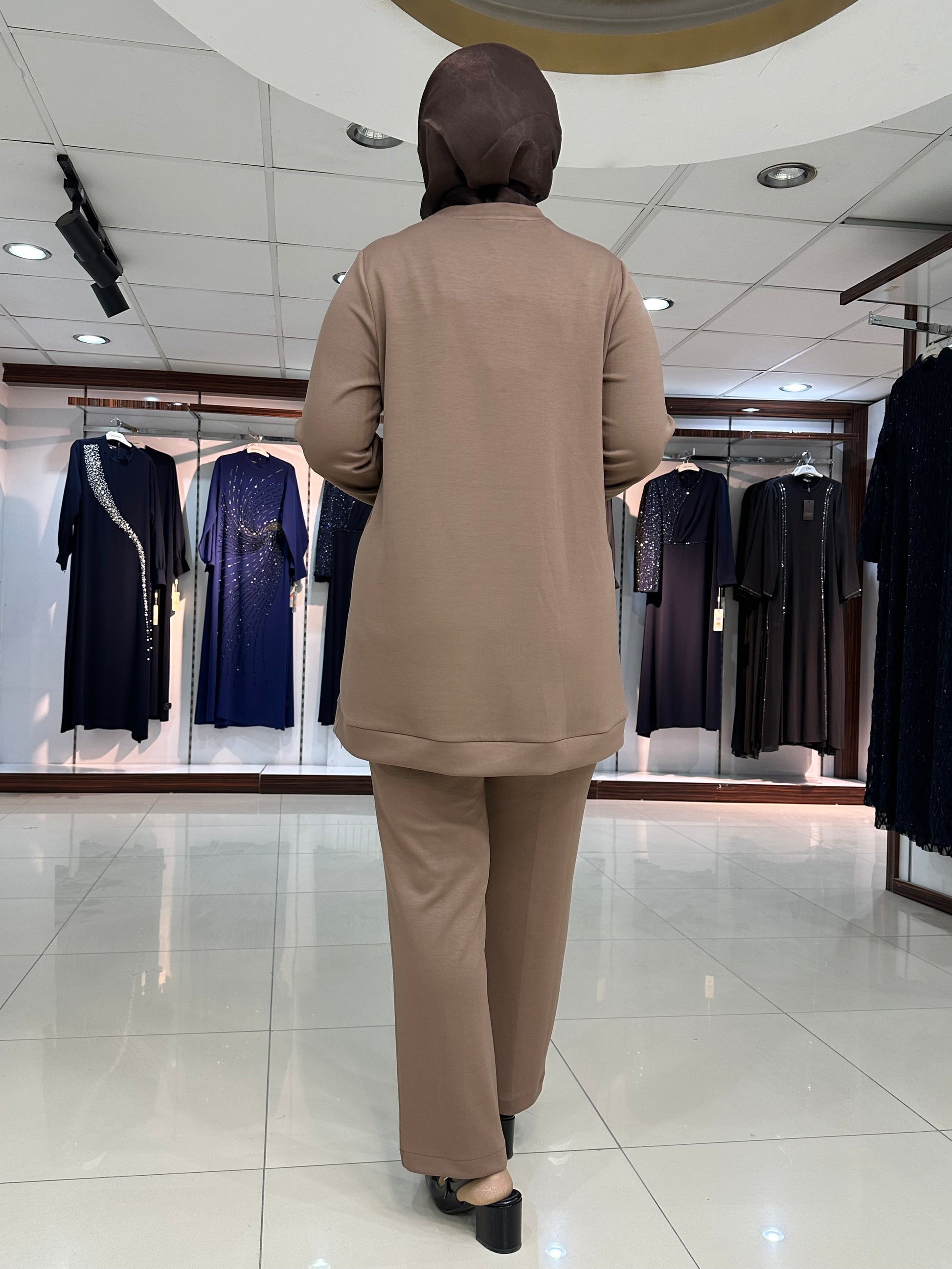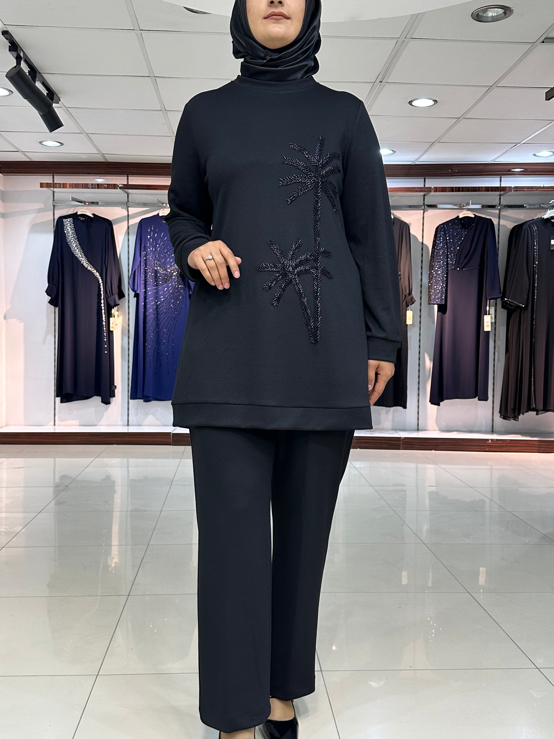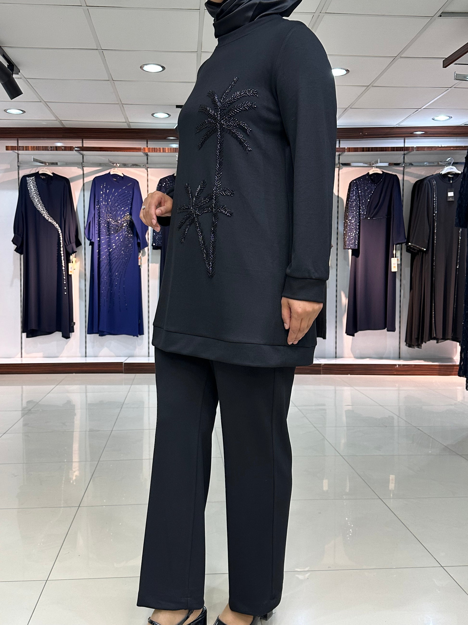 Rahat kalıp, sıfır yaka, dikme boncuk işleme, kol ribanalı tunik ile pantolon bel lastikli, yandan cepli, rahat kalıp, bol paçalı modelimizdir.