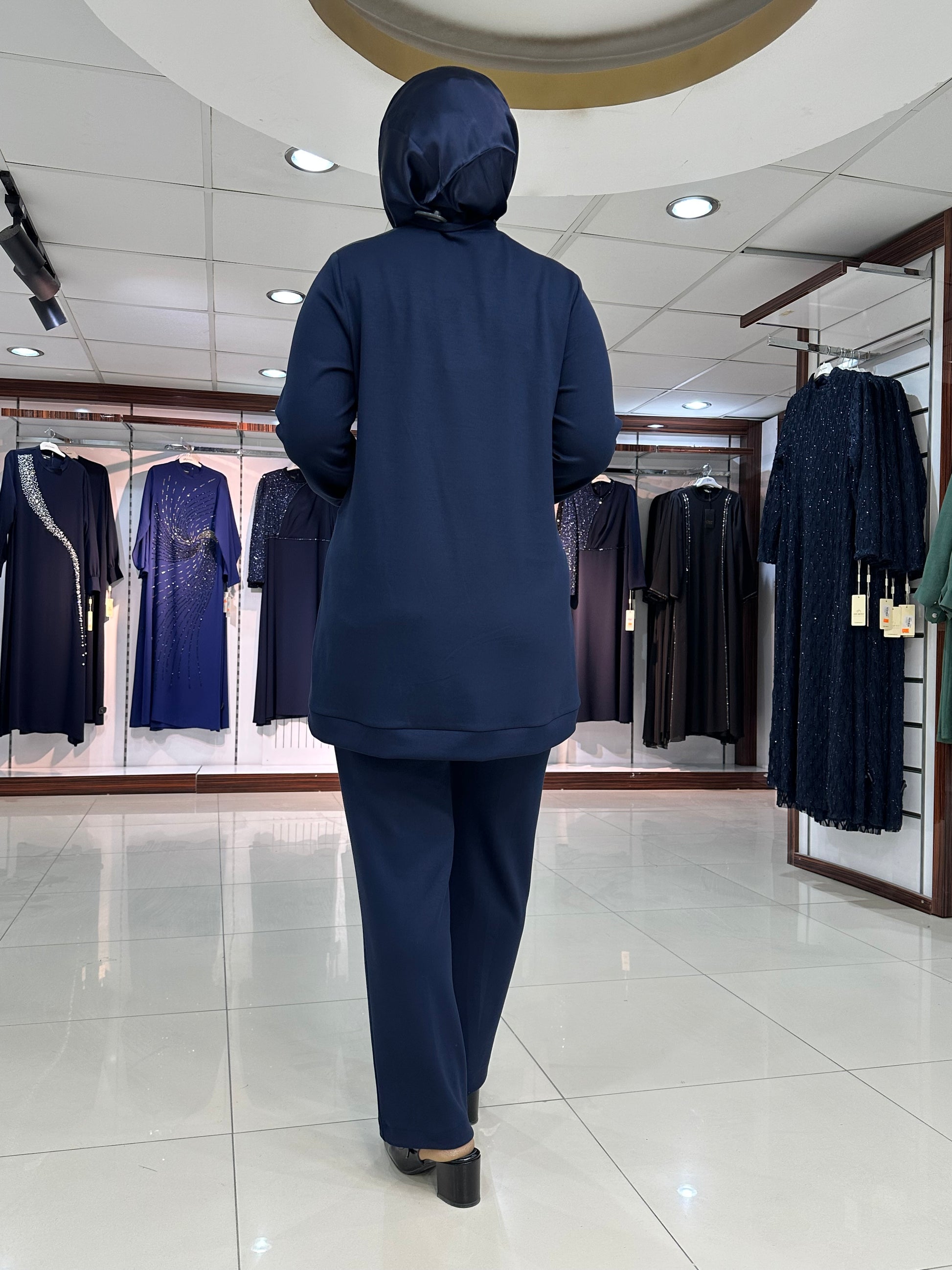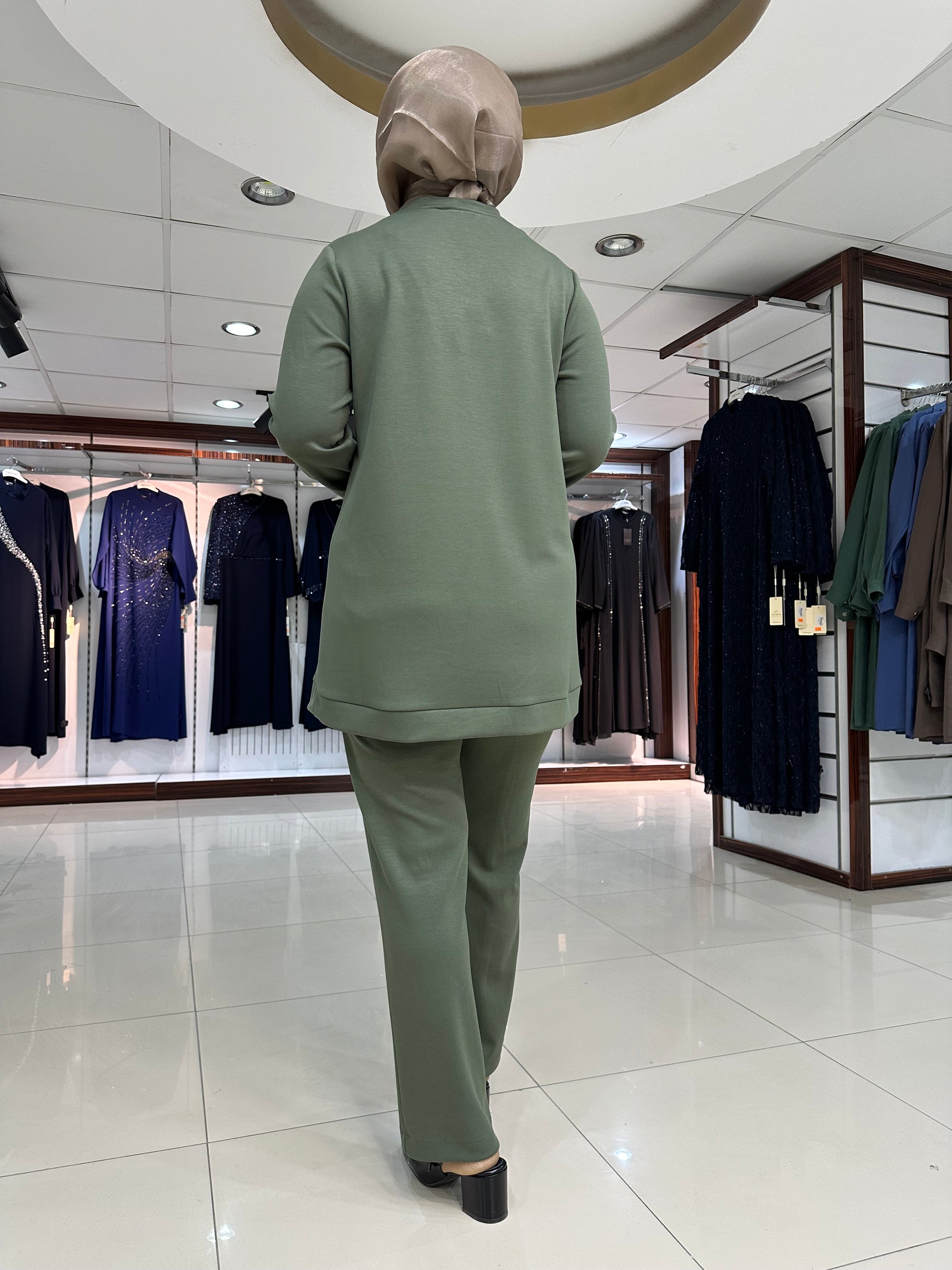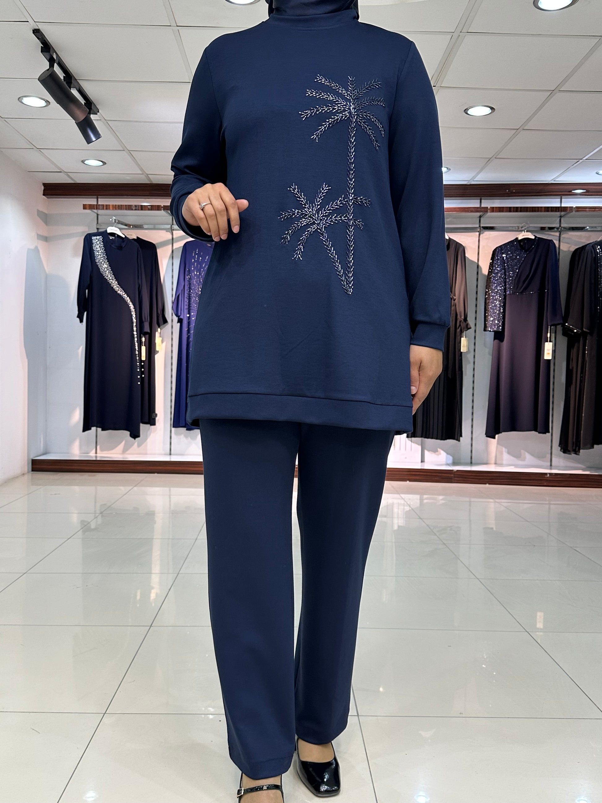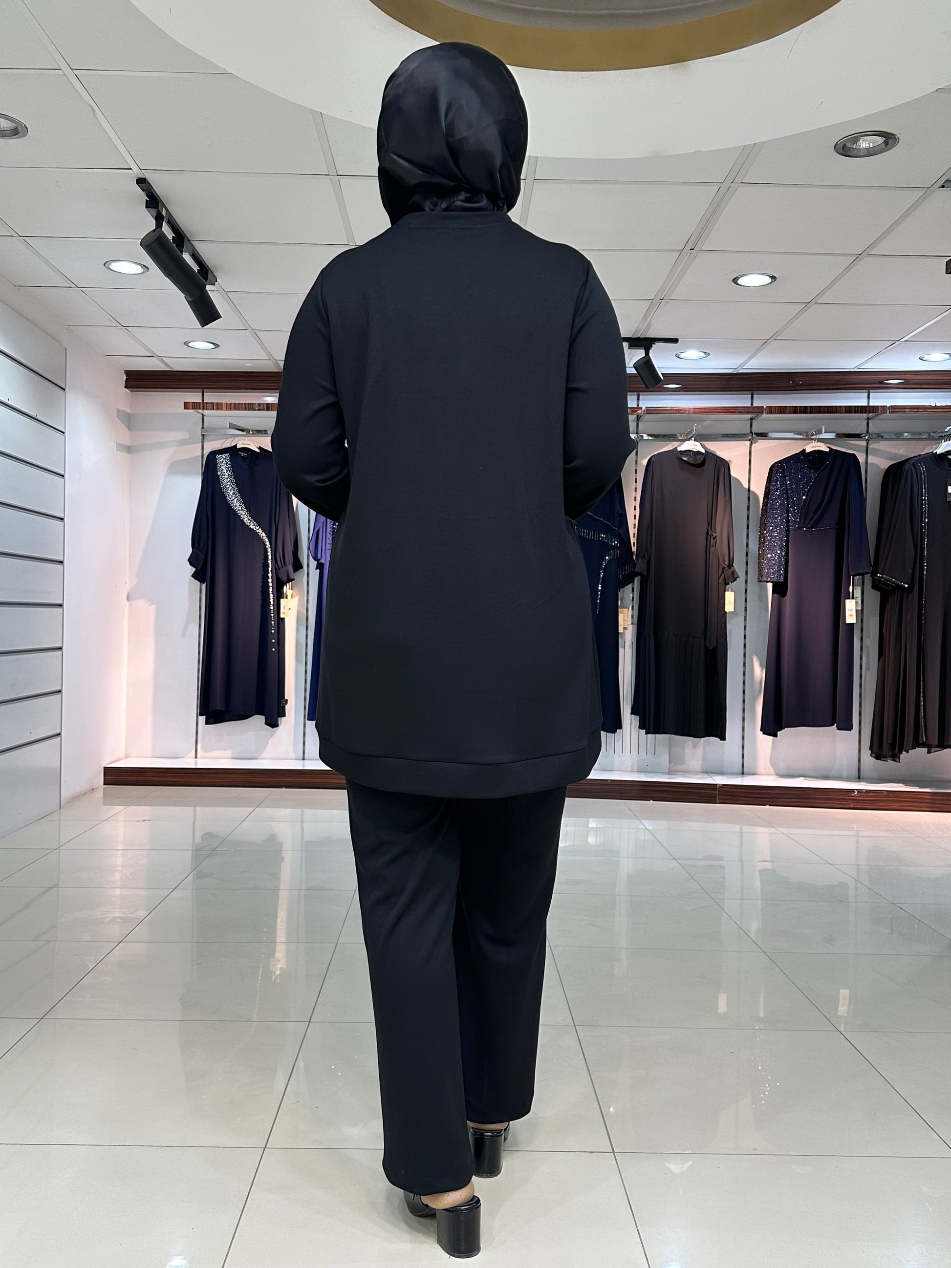 Rahat kalıp, sıfır yaka, dikme boncuk işleme, kol ribanalı tunik ile pantolon bel lastikli, yandan cepli, rahat kalıp, bol paçalı modelimizdir.