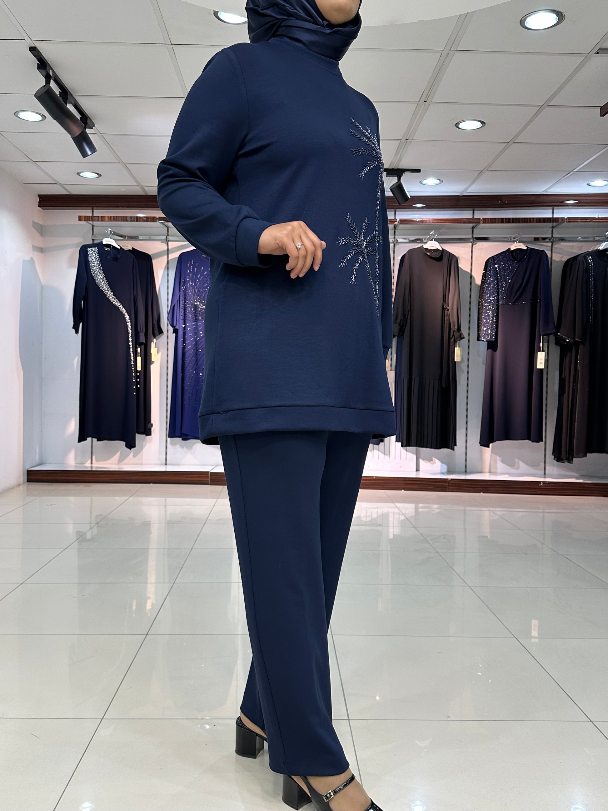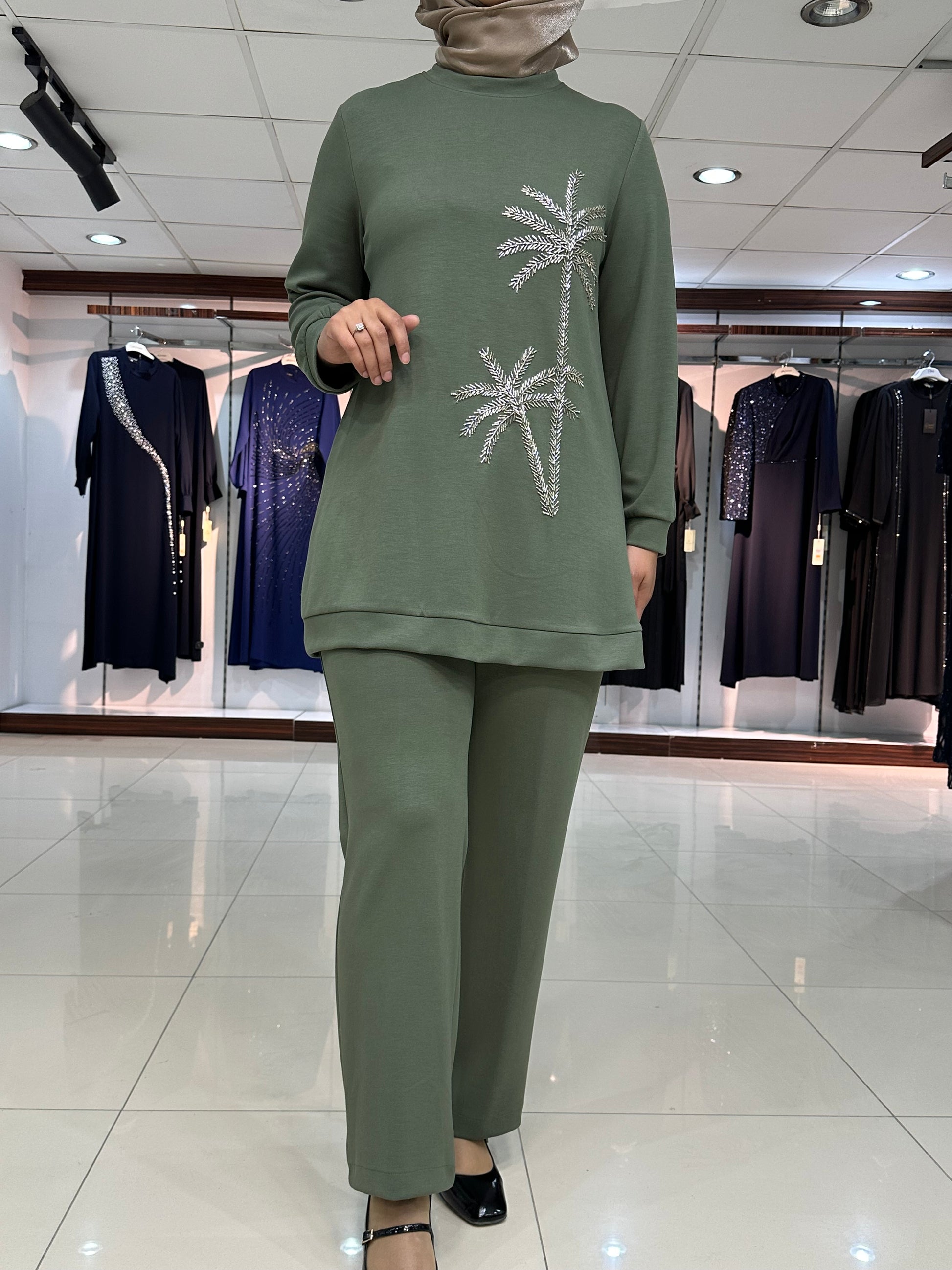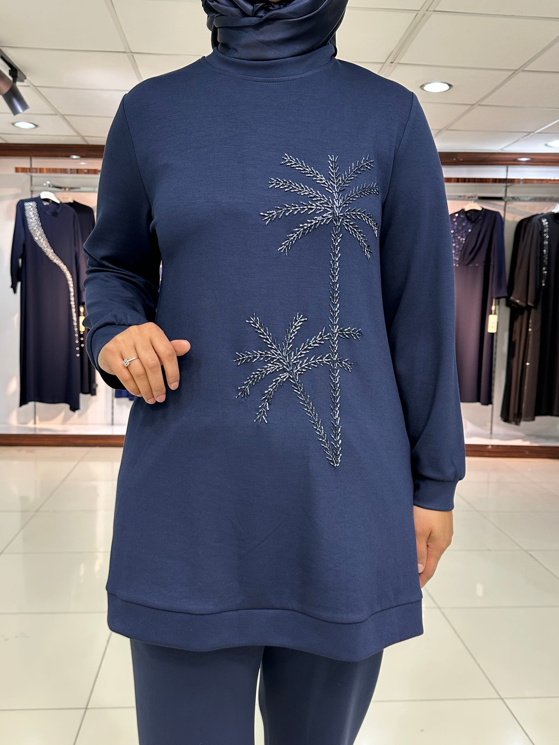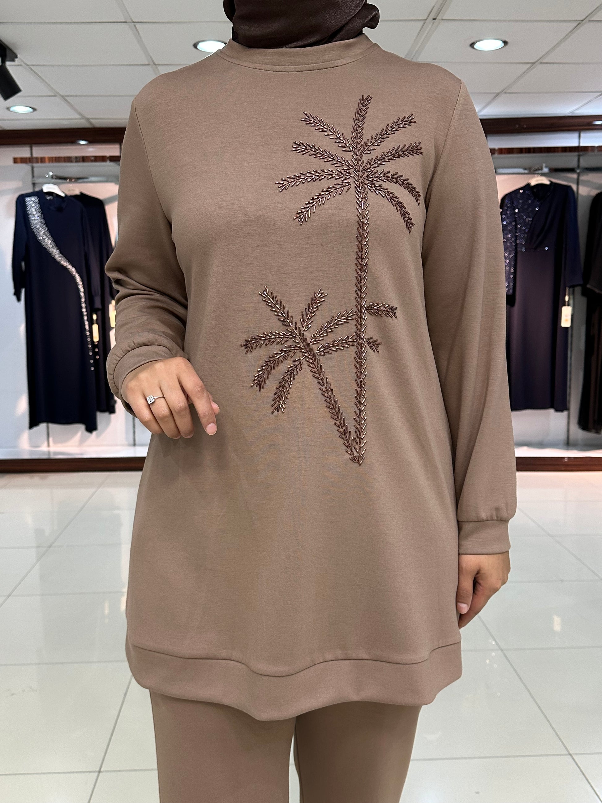 Rahat kalıp, sıfır yaka, dikme boncuk işleme, kol ribanalı tunik ile pantolon bel lastikli, yandan cepli, rahat kalıp, bol paçalı modelimizdir.