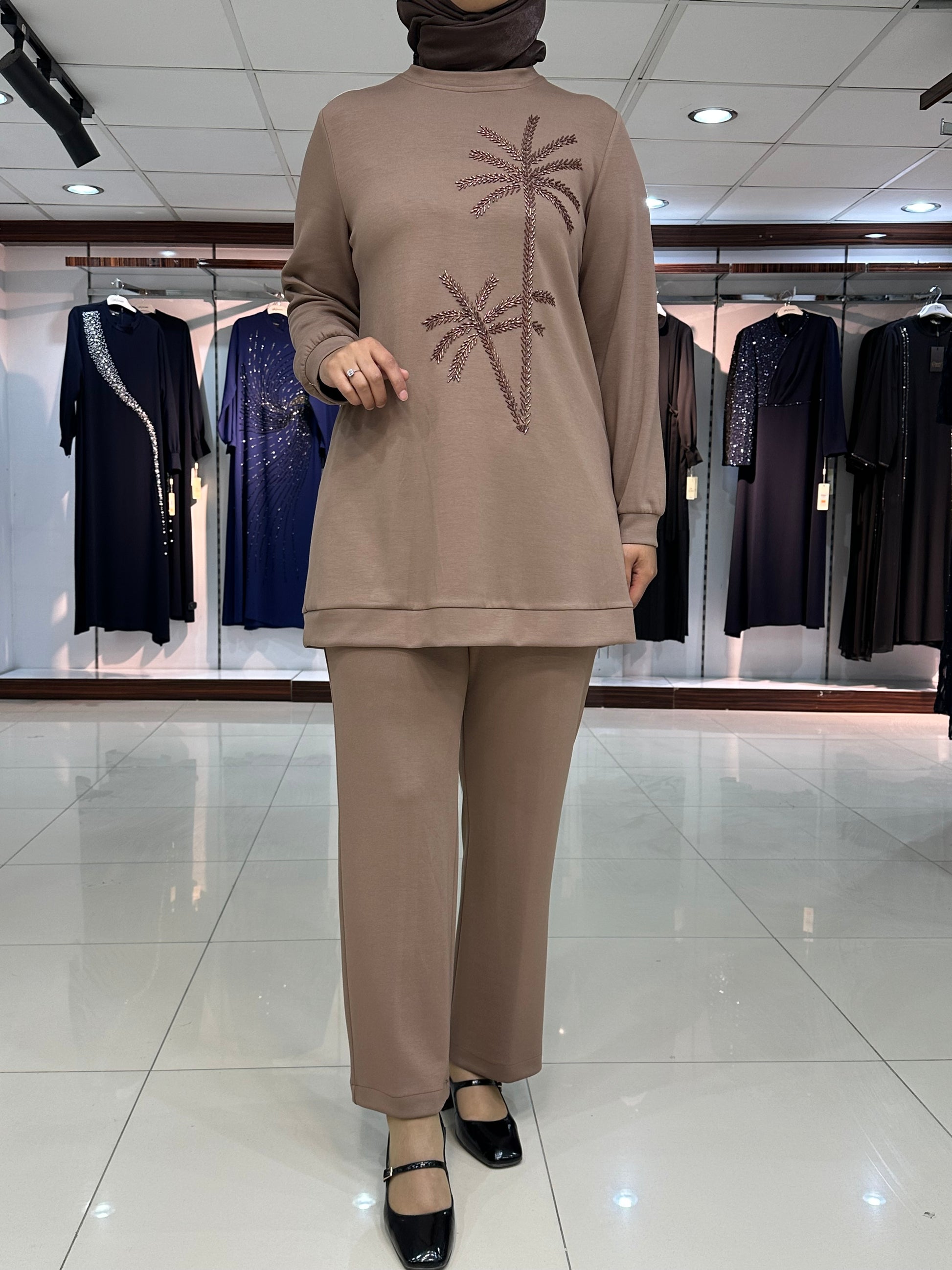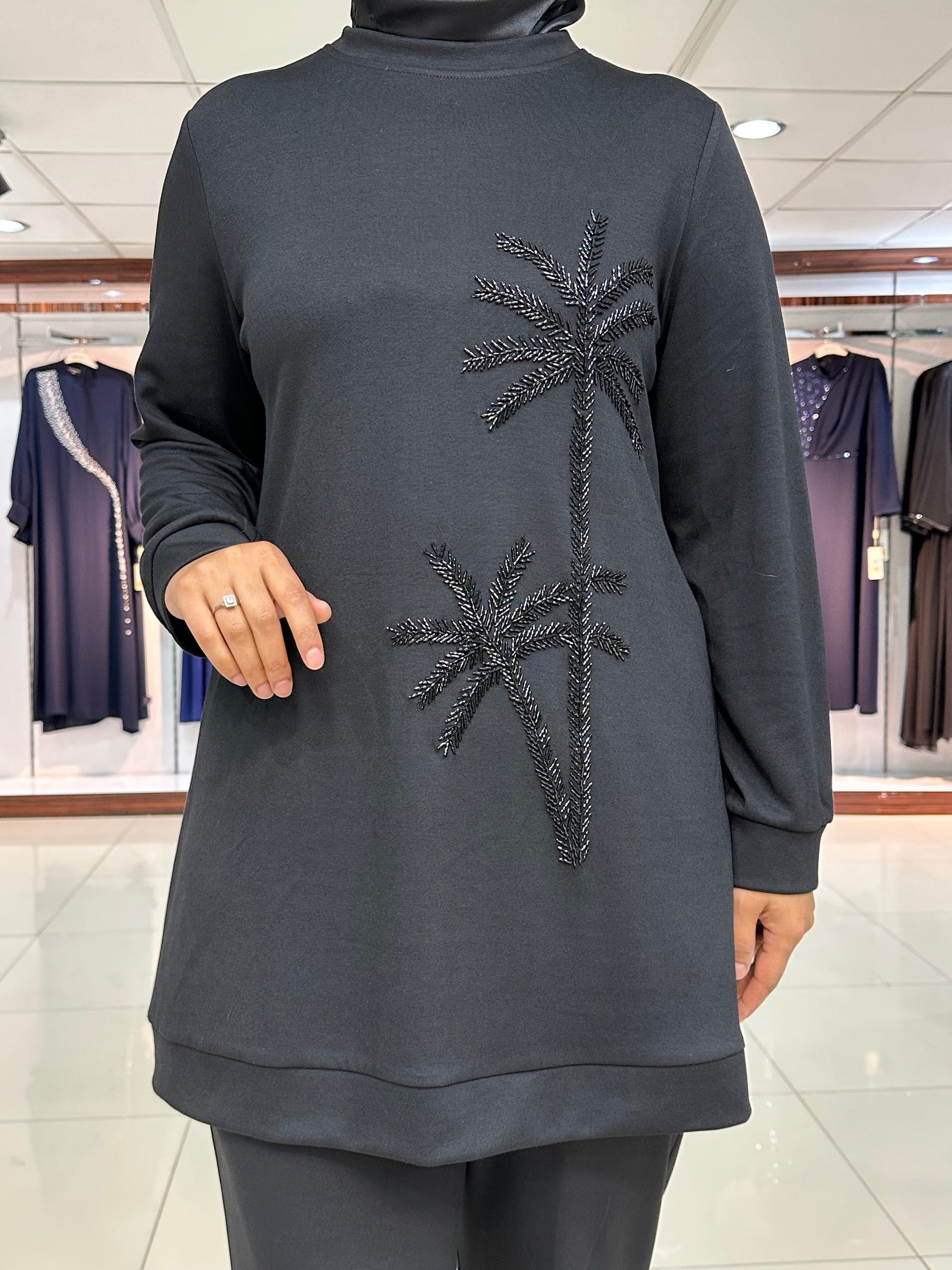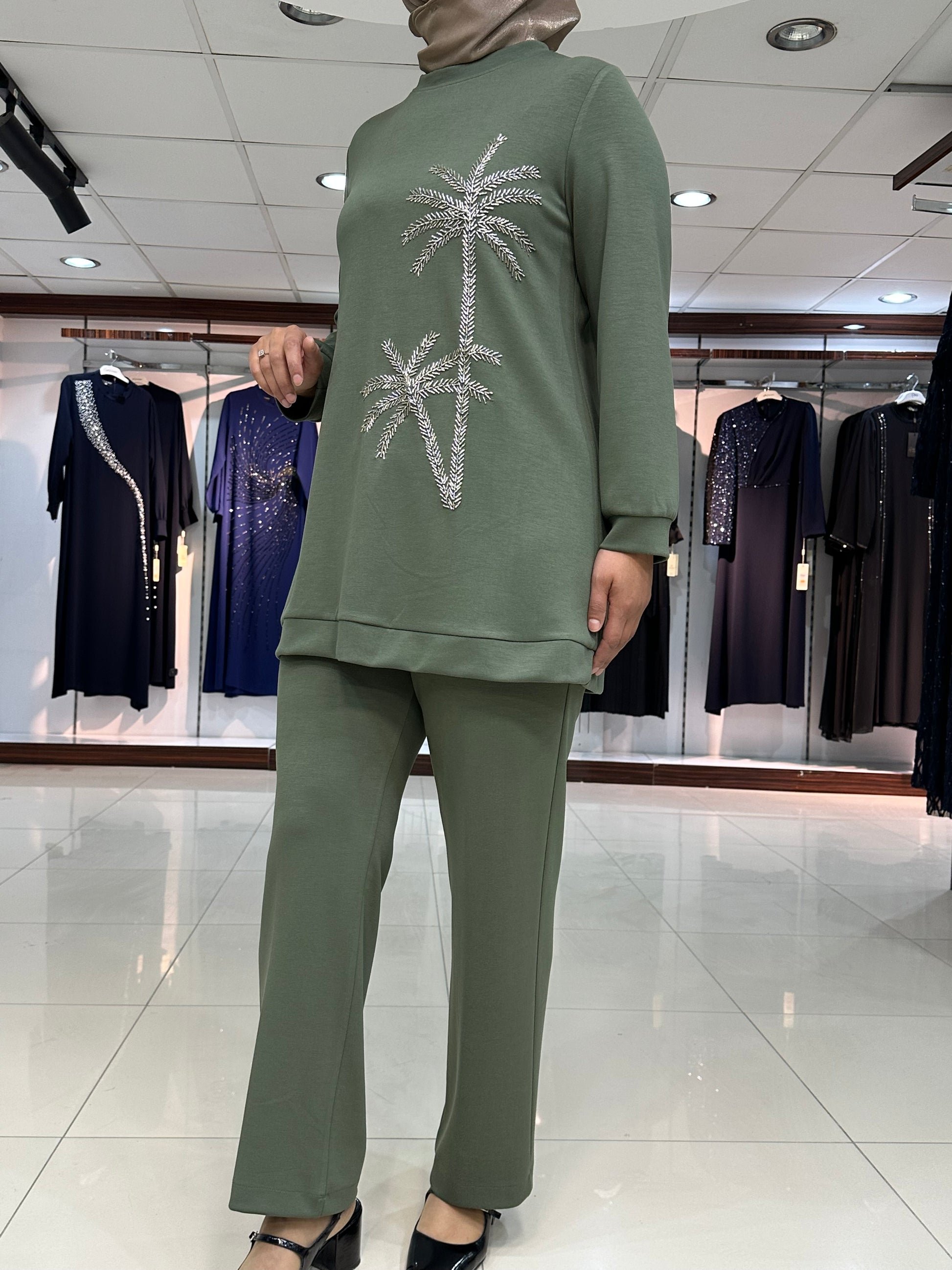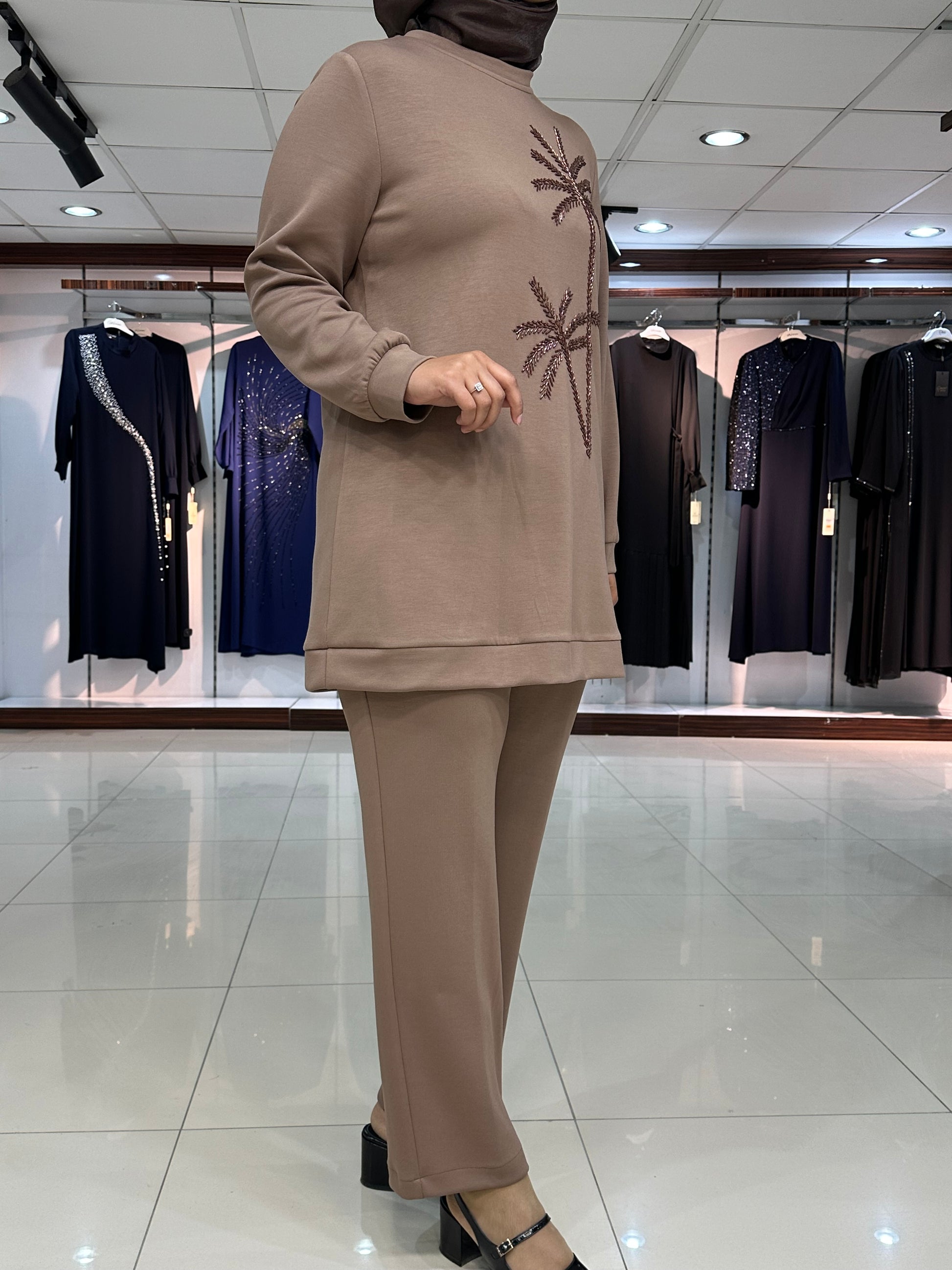 Rahat kalıp, sıfır yaka, dikme boncuk işleme, kol ribanalı tunik ile pantolon bel lastikli, yandan cepli, rahat kalıp, bol paçalı modelimizdir.