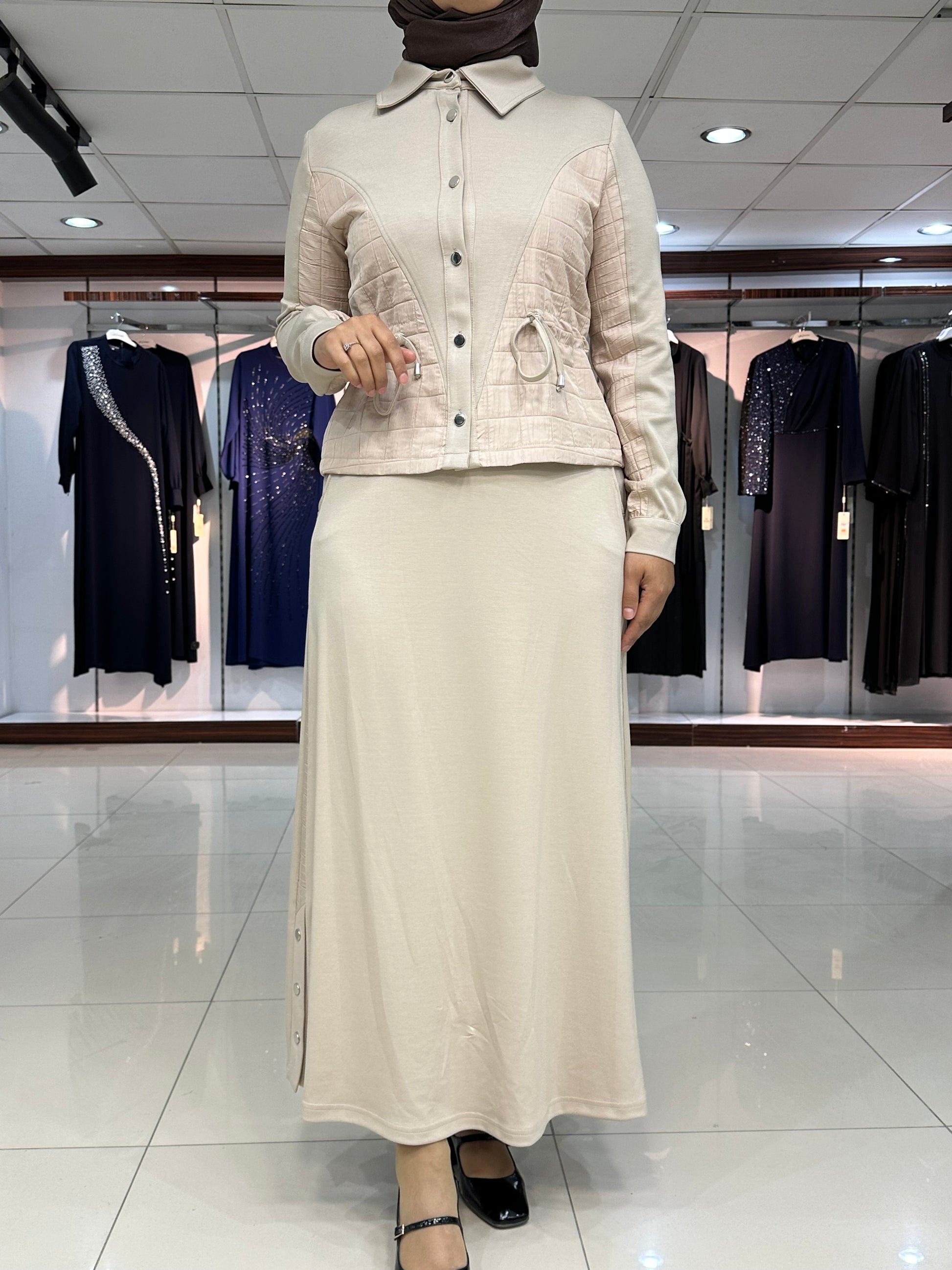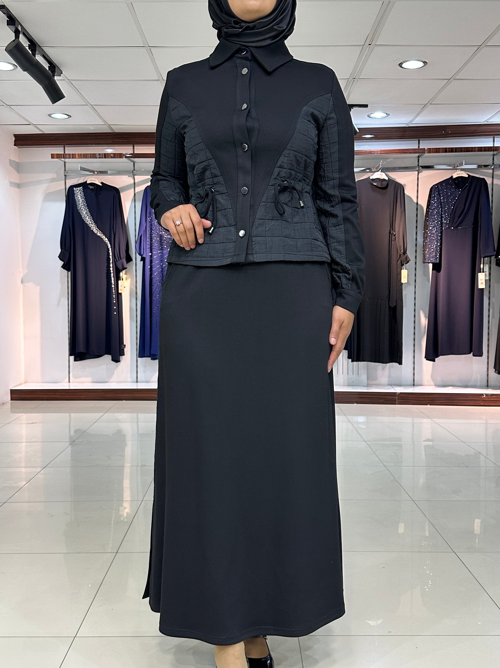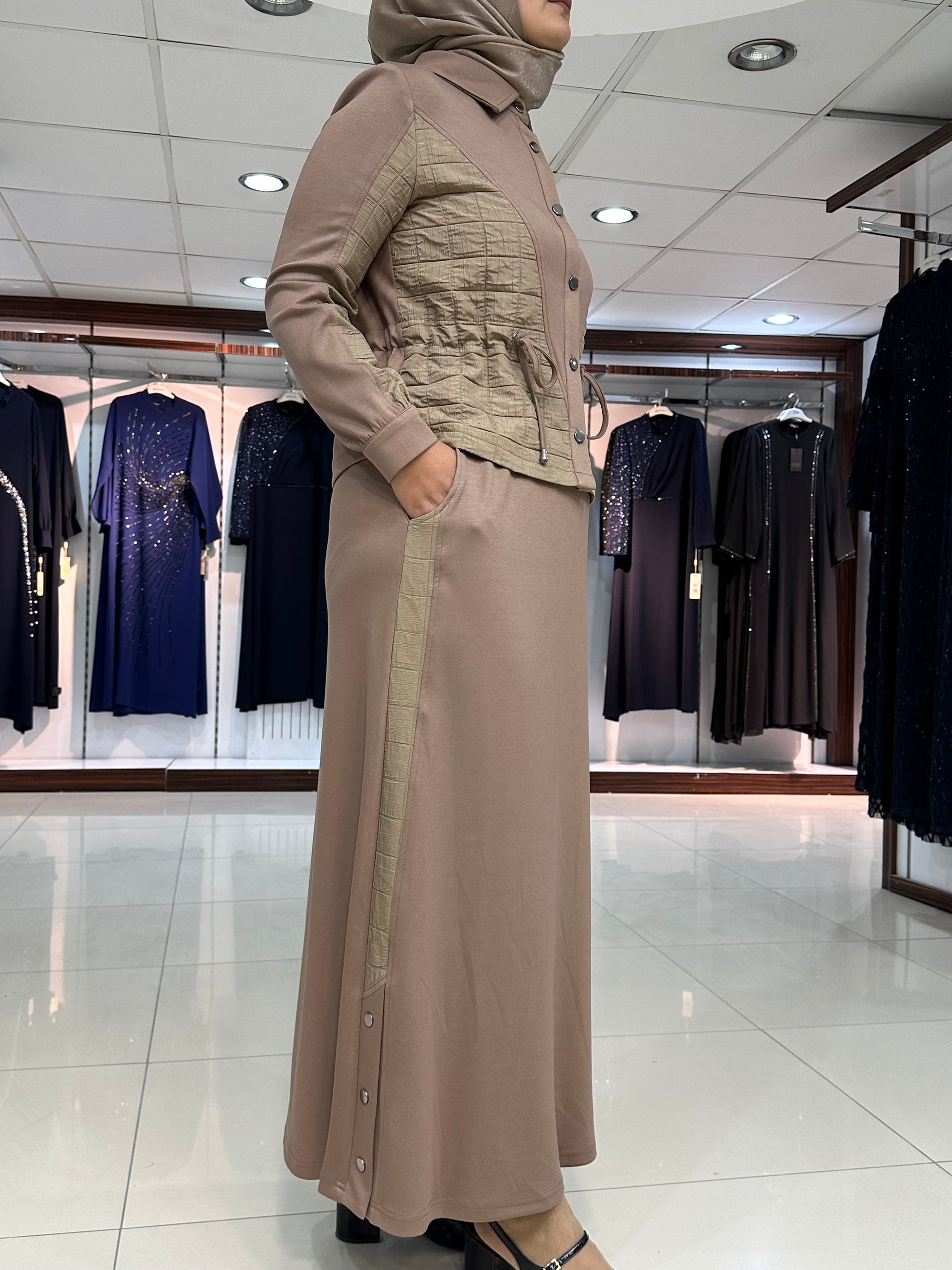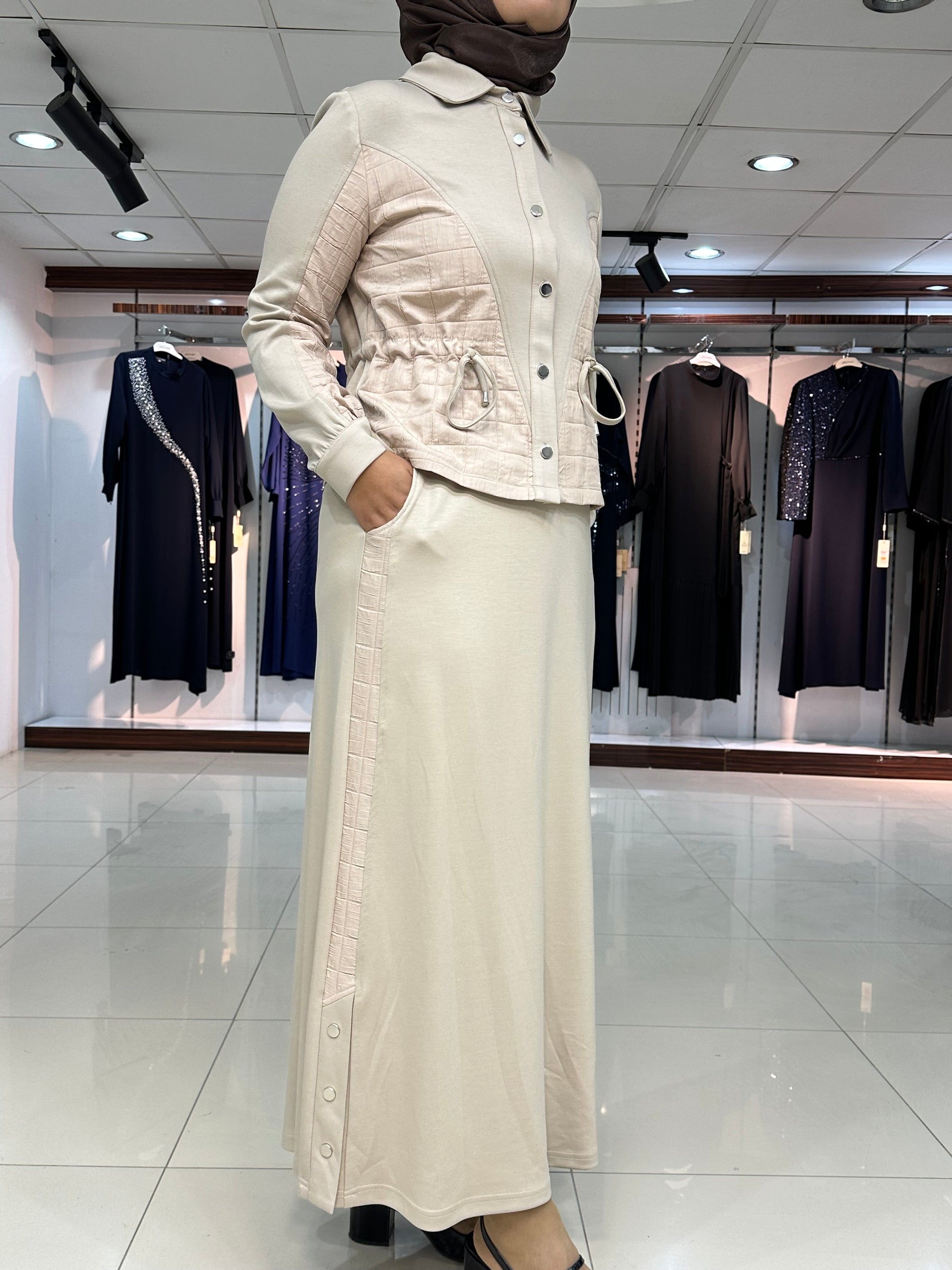 Ceket düğmeli, kapitone işleme detay, gizli yan bağcıklar, yakalı ve kol ağız manşet düğmeli. Etek bel lastikli, çan kesim, şerit kapitone detay ve yan düğmeli modelimiz.