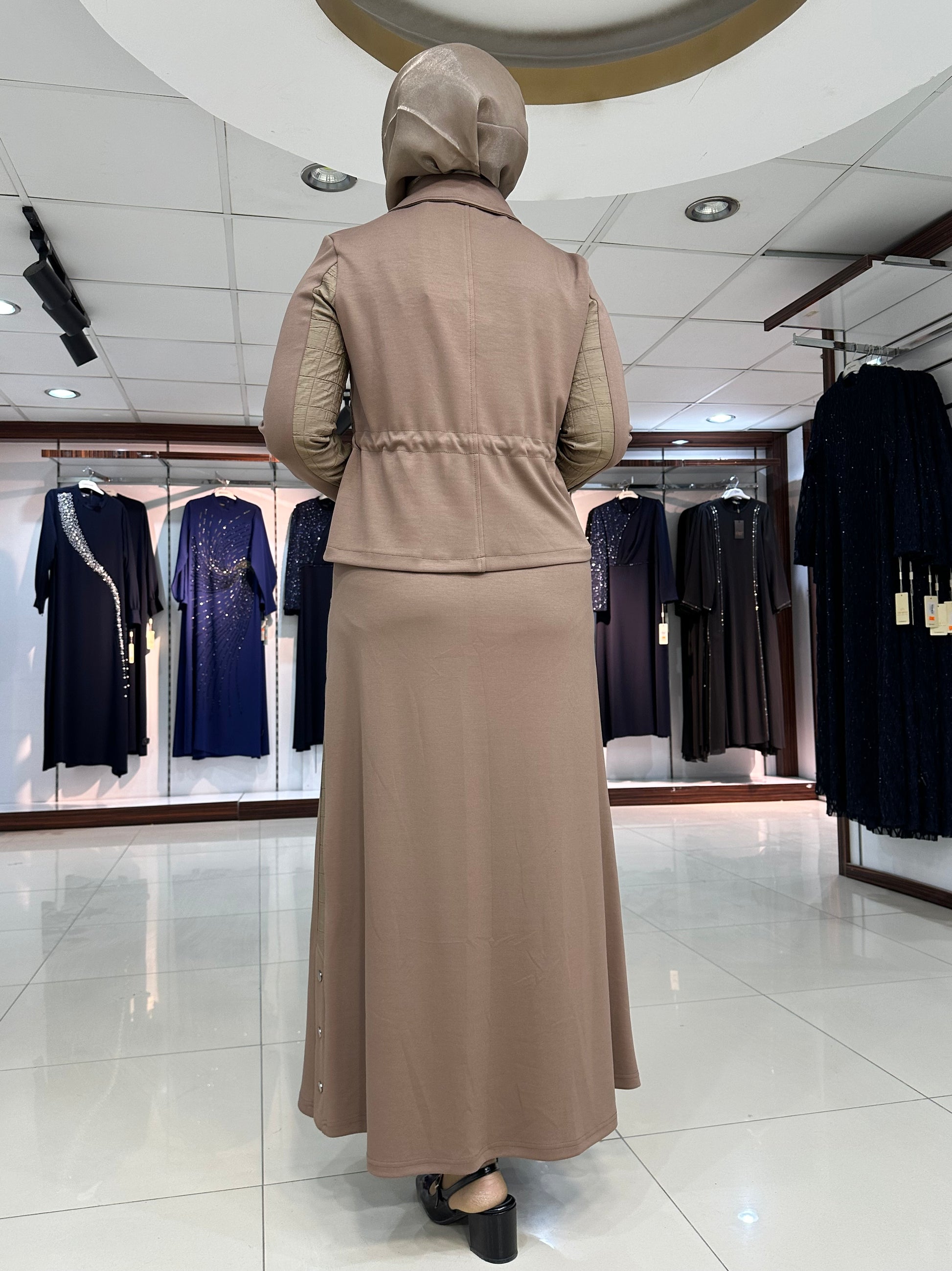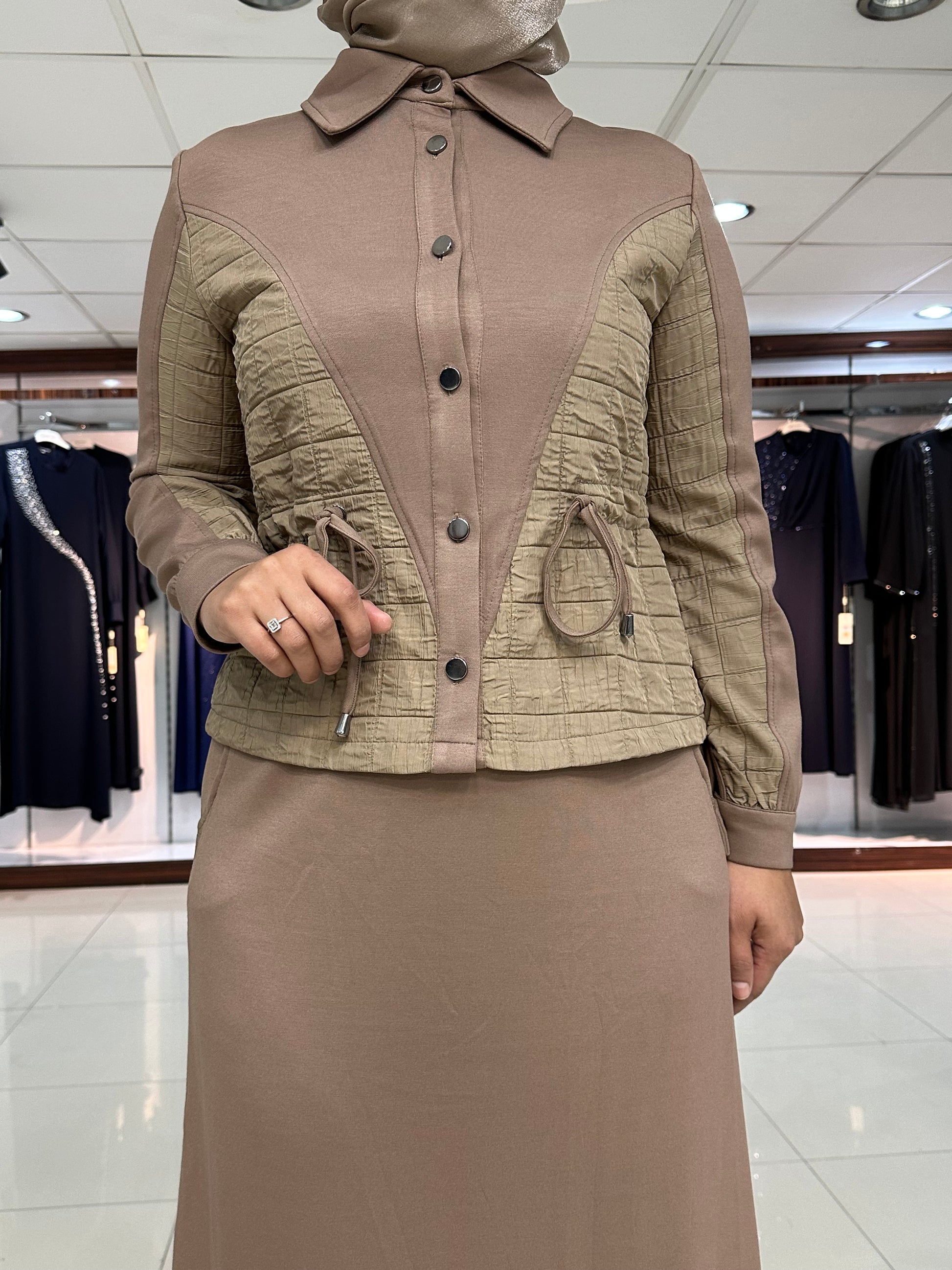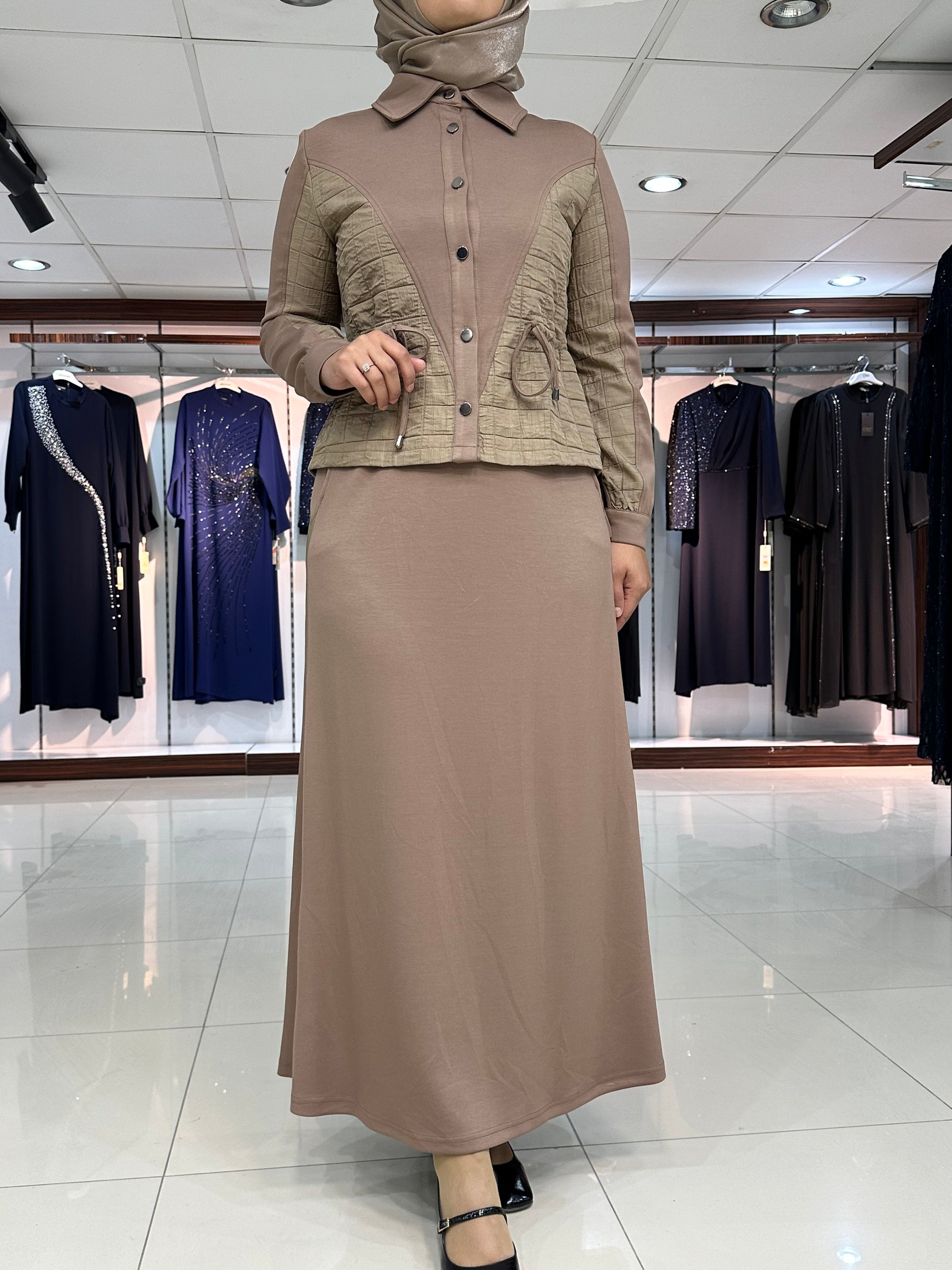 Ceket düğmeli, kapitone işleme detay, gizli yan bağcıklar, yakalı ve kol ağız manşet düğmeli. Etek bel lastikli, çan kesim, şerit kapitone detay ve yan düğmeli modelimiz.