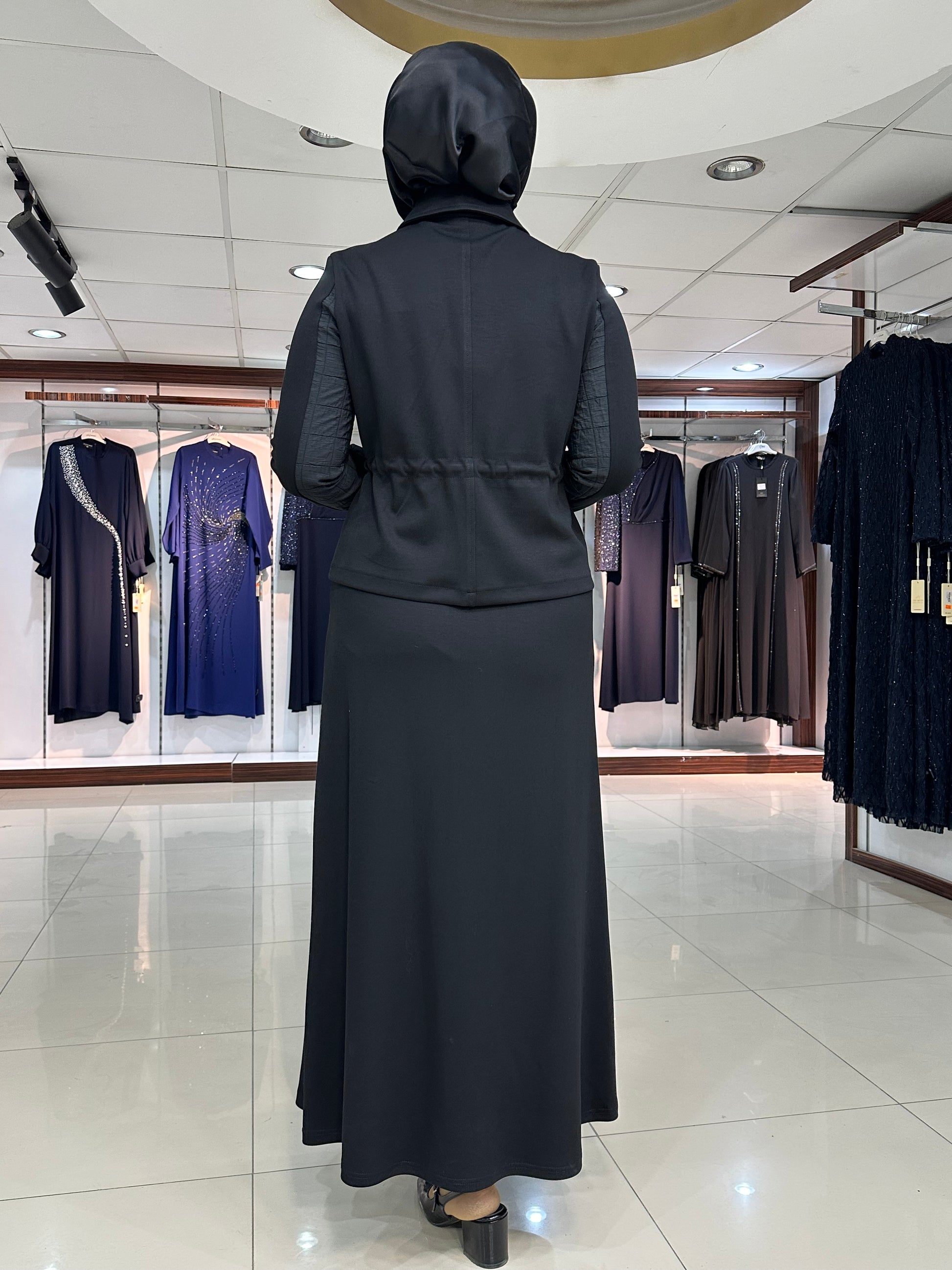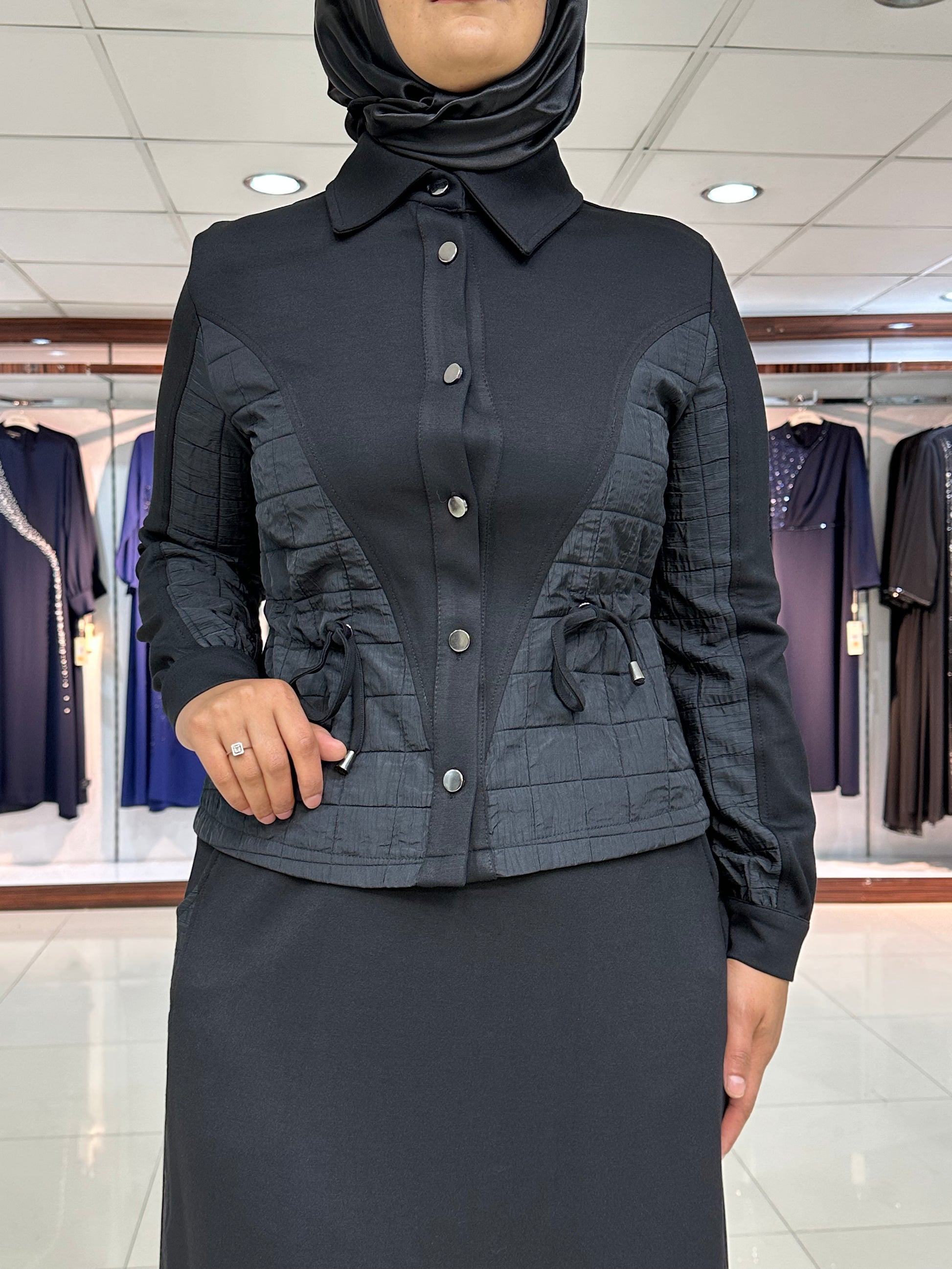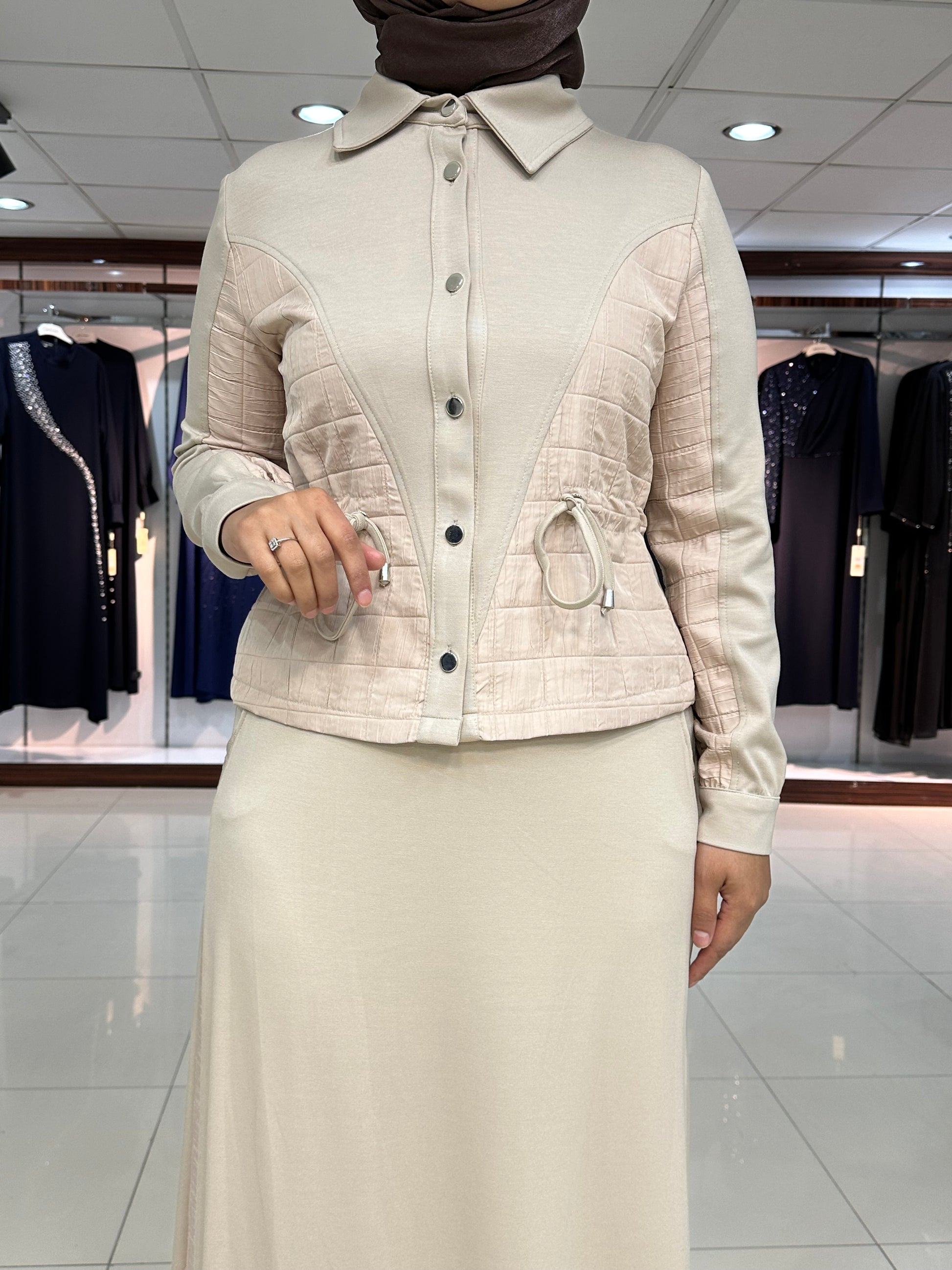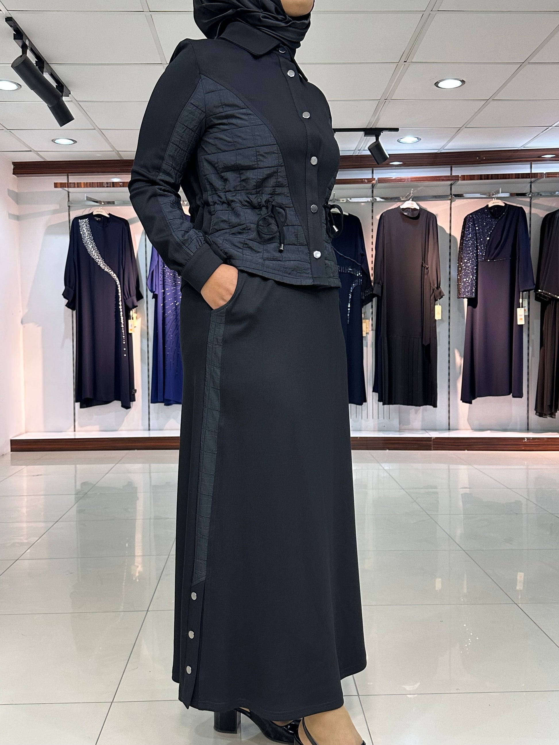 Ceket düğmeli, kapitone işleme detay, gizli yan bağcıklar, yakalı ve kol ağız manşet düğmeli. Etek bel lastikli, çan kesim, şerit kapitone detay ve yan düğmeli modelimiz.