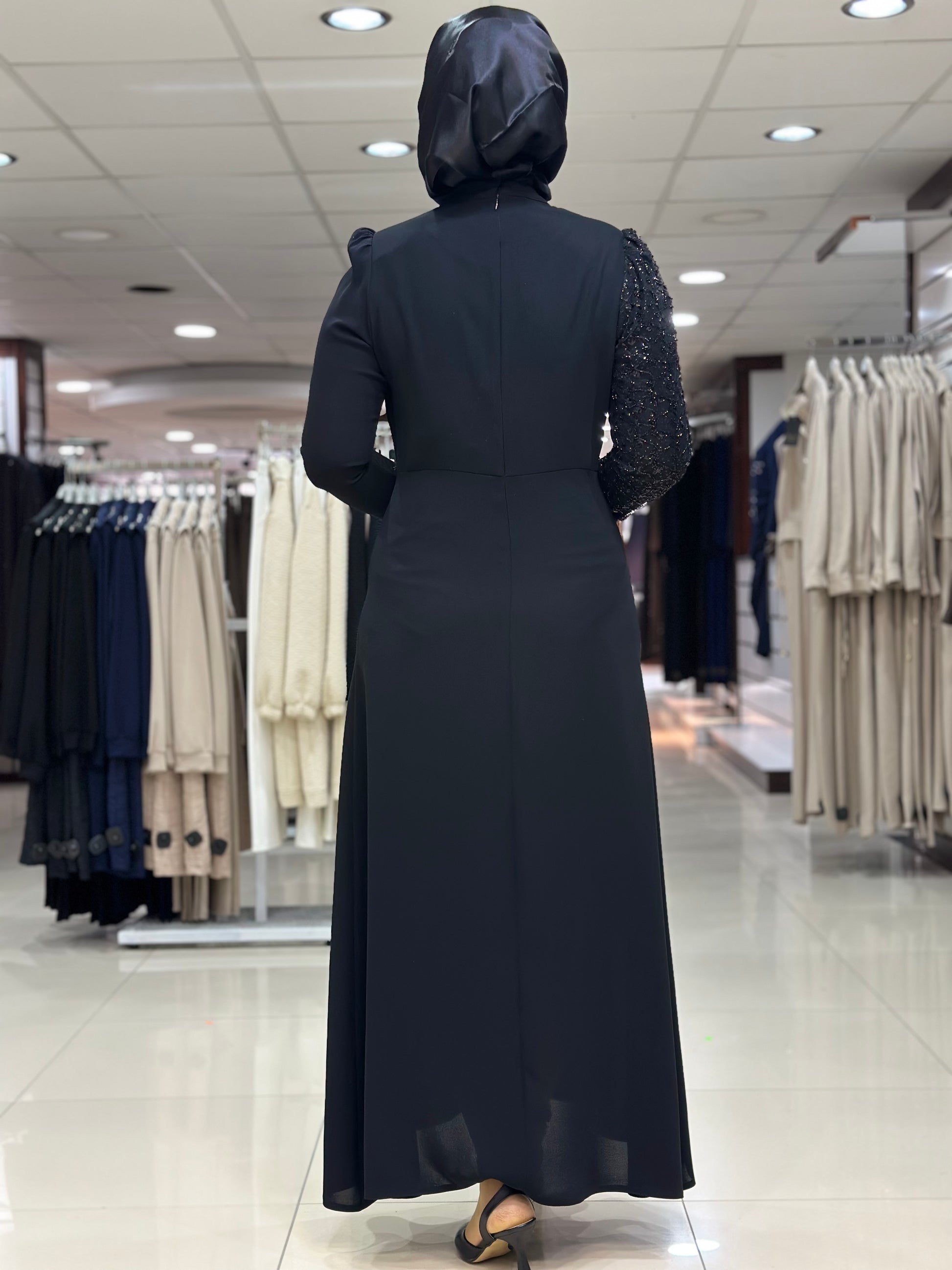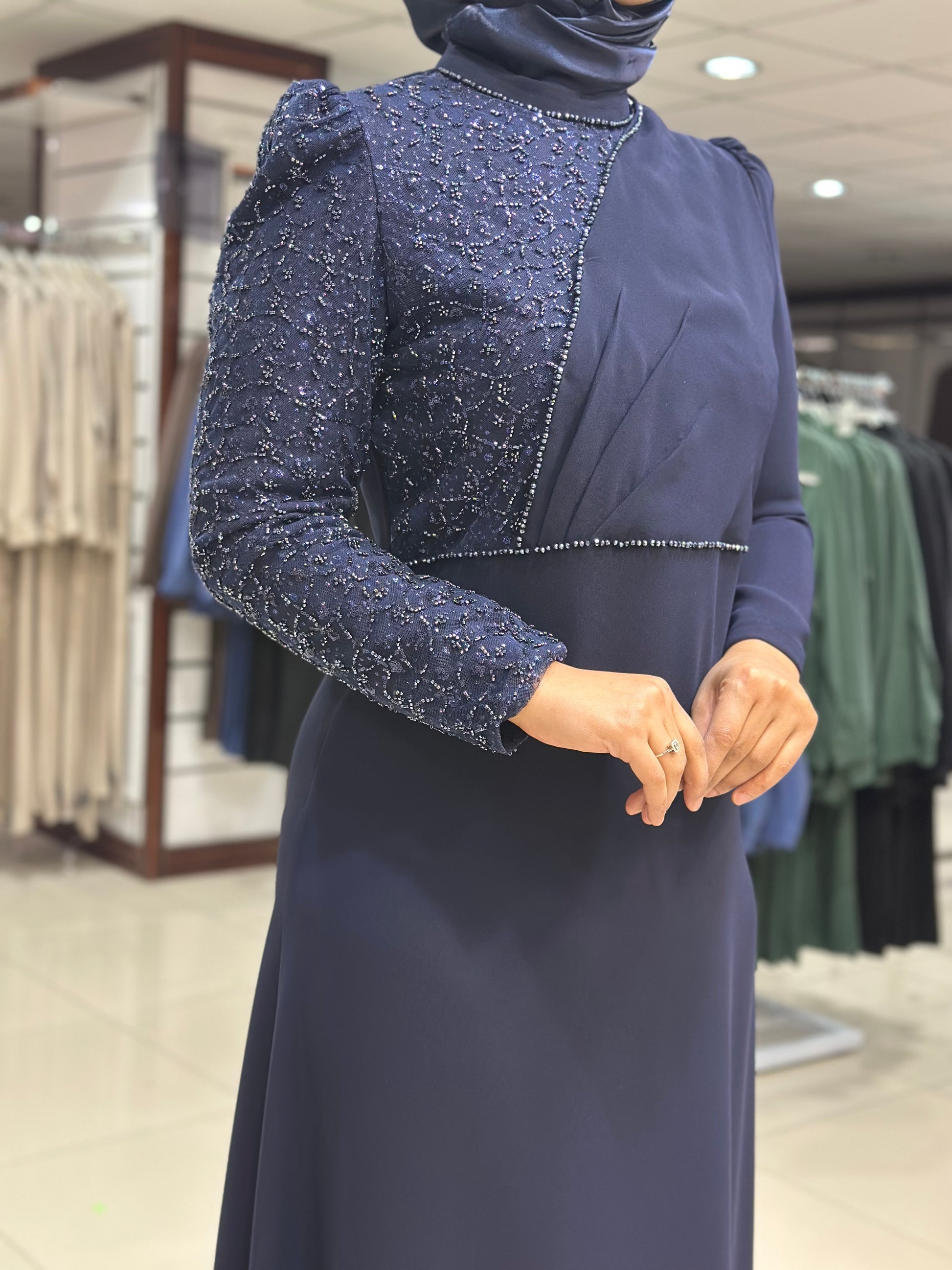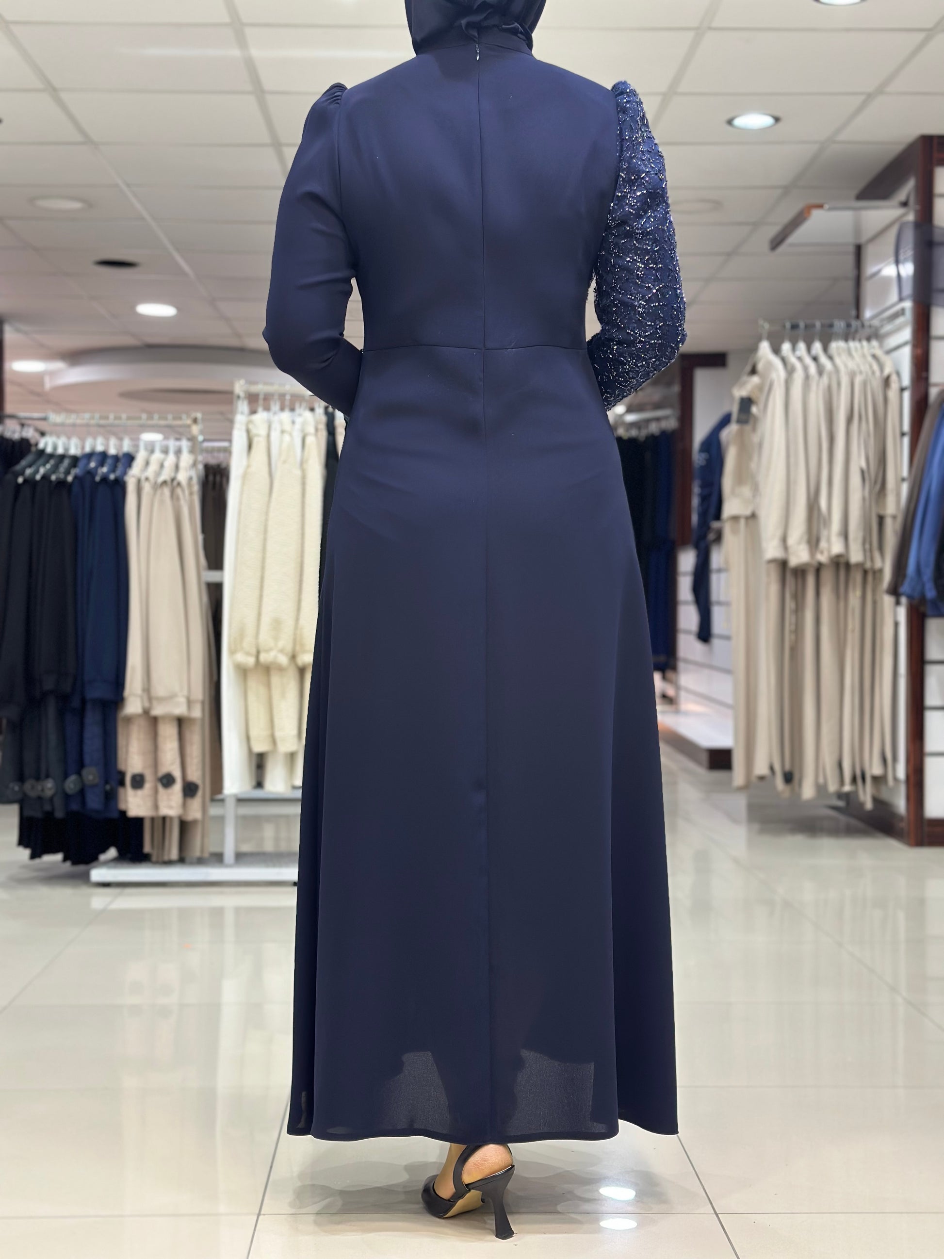 full boncuk işlemeli hakim yaka sırt yarım gizli fermuar astarlı kalem kesim