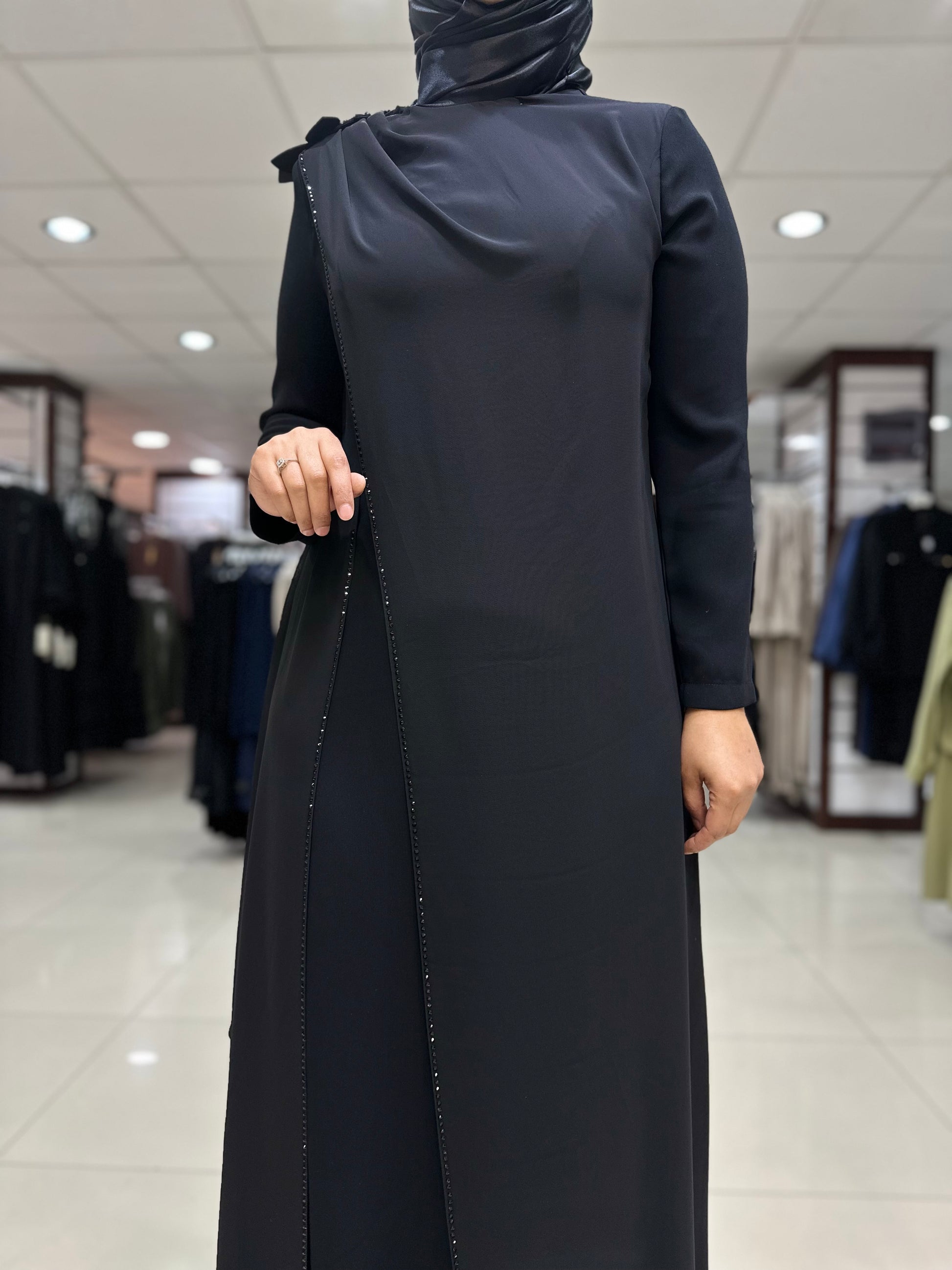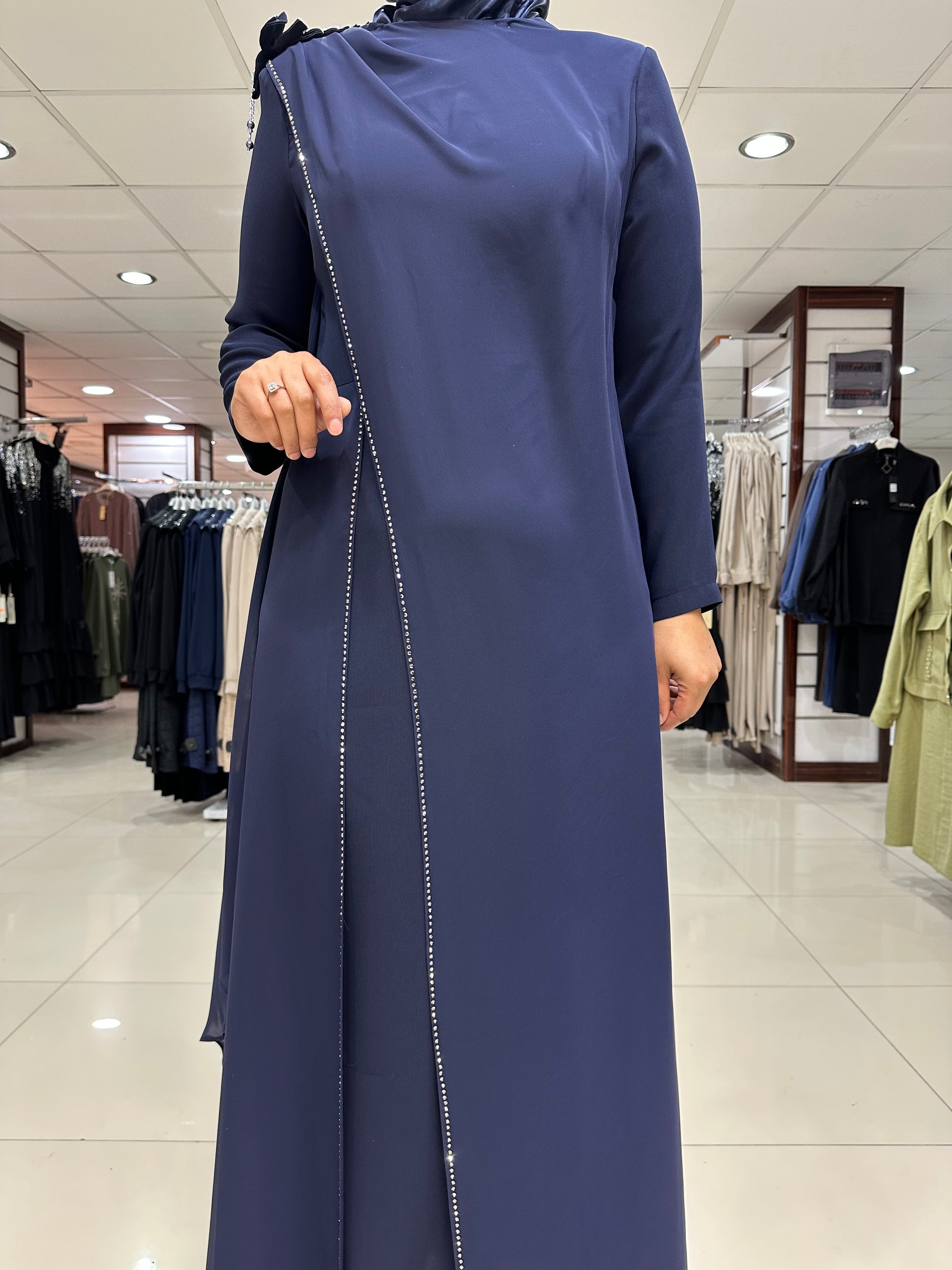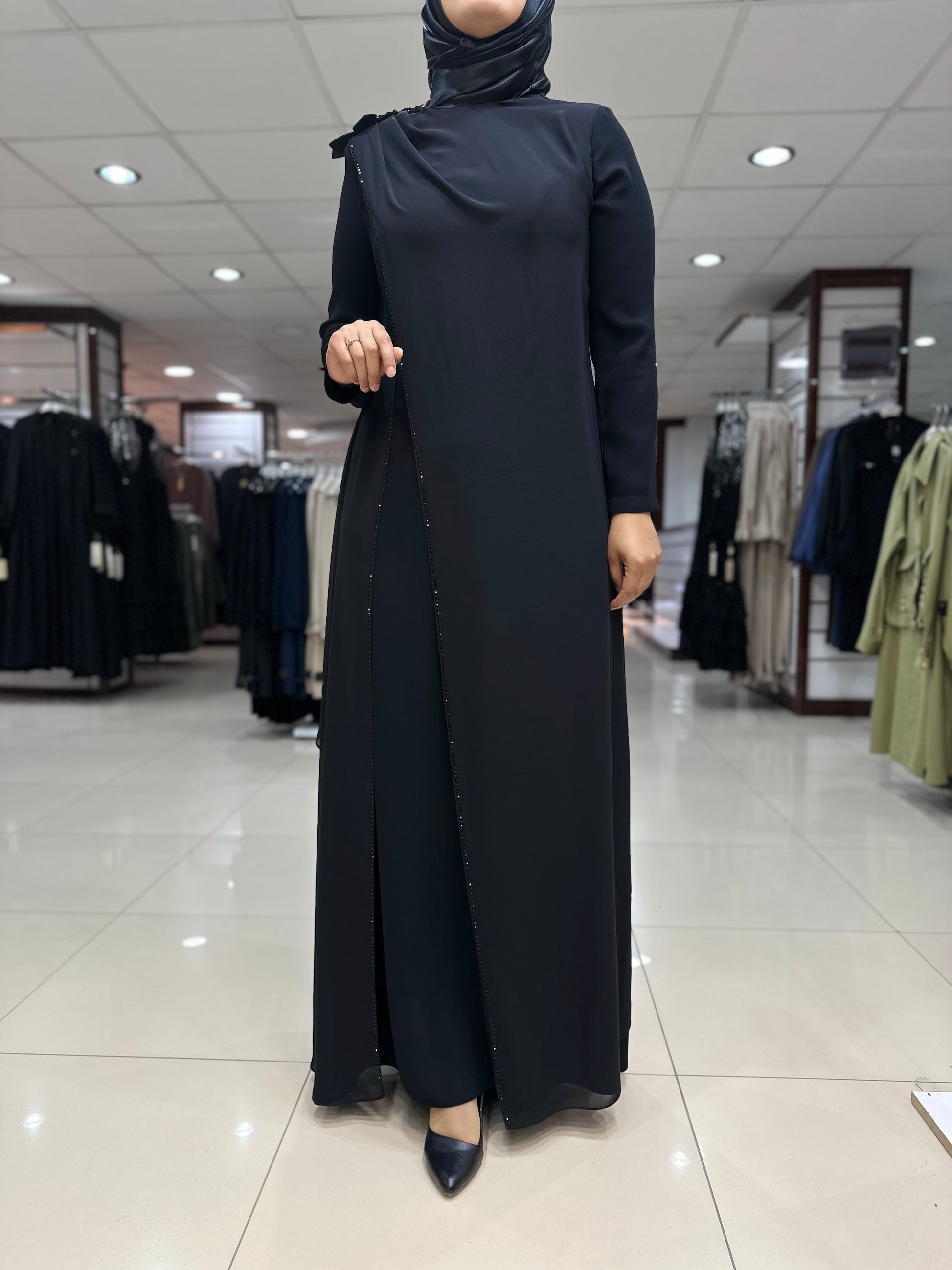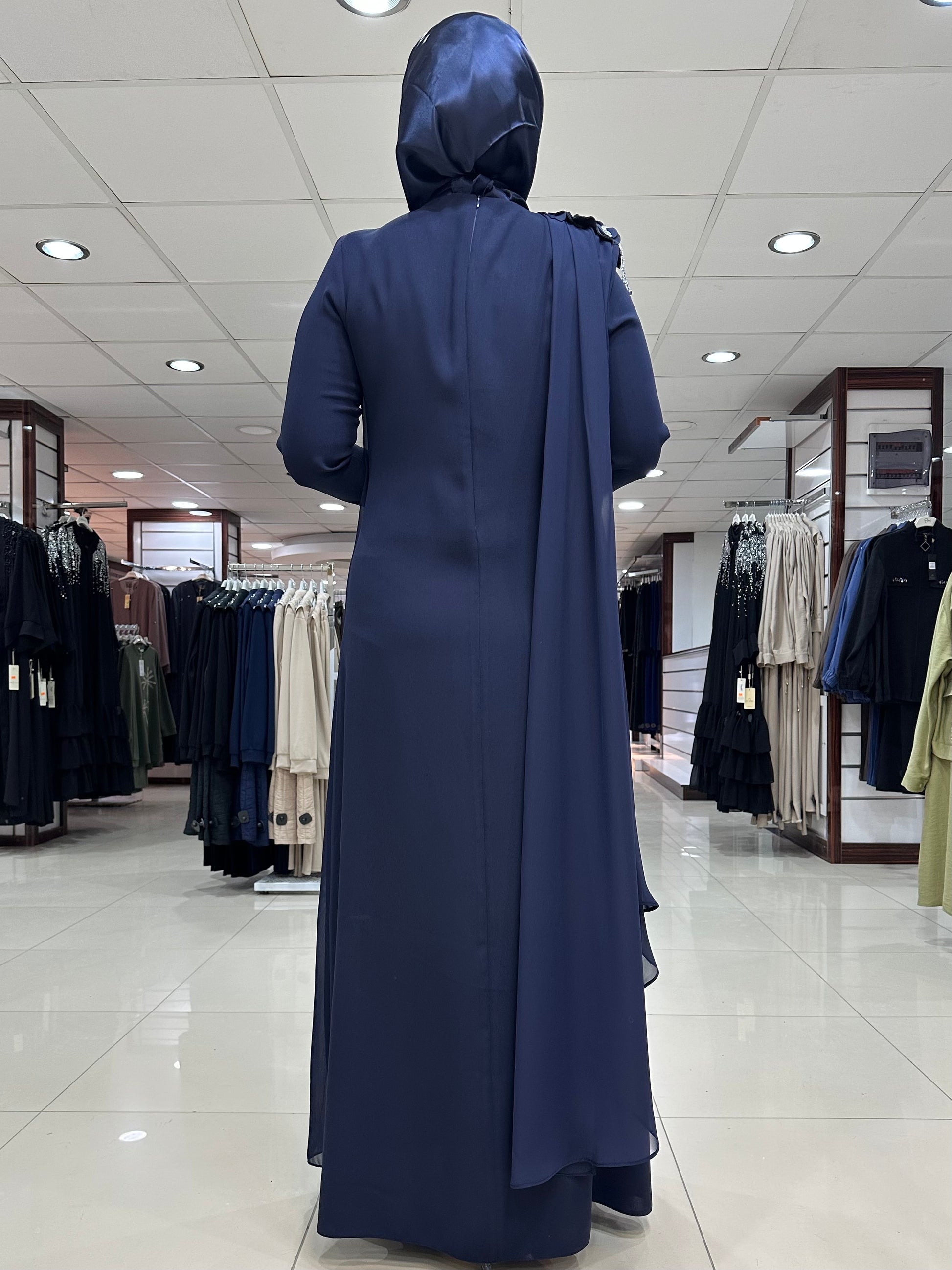omuzda gül detaylı boydan şifon ucu taşlı detay rahat kalıp sıfır yaka sırt gizli fermuar şifon detay elbisenin üzerine dikilidir