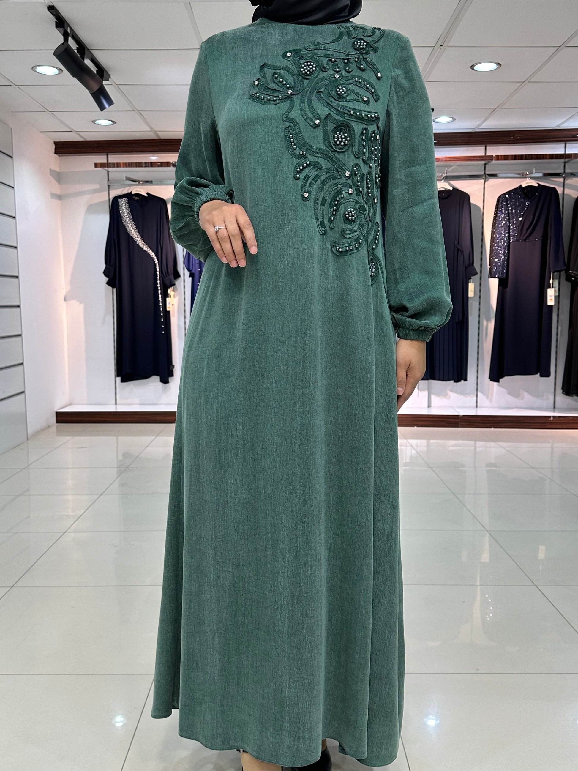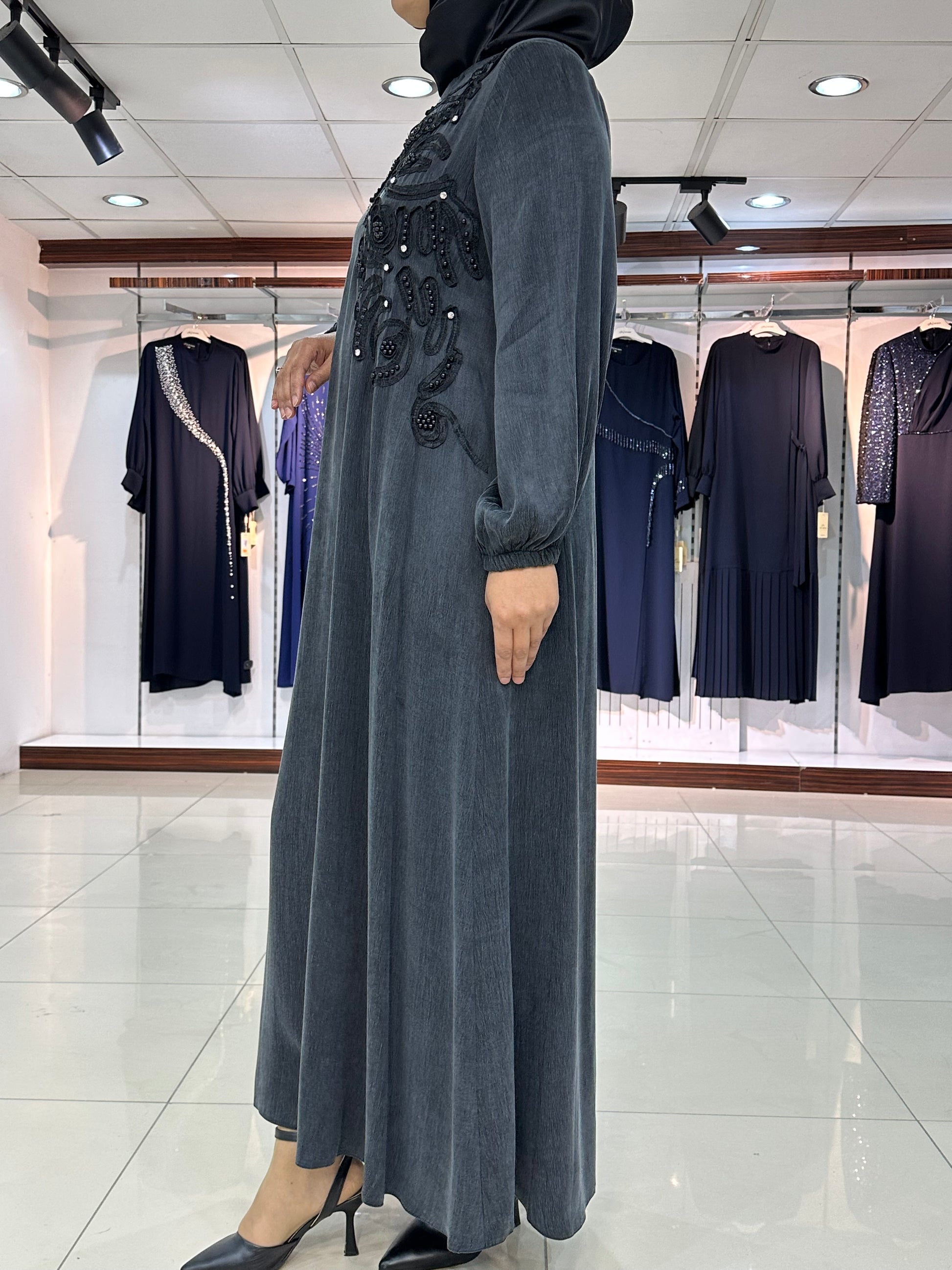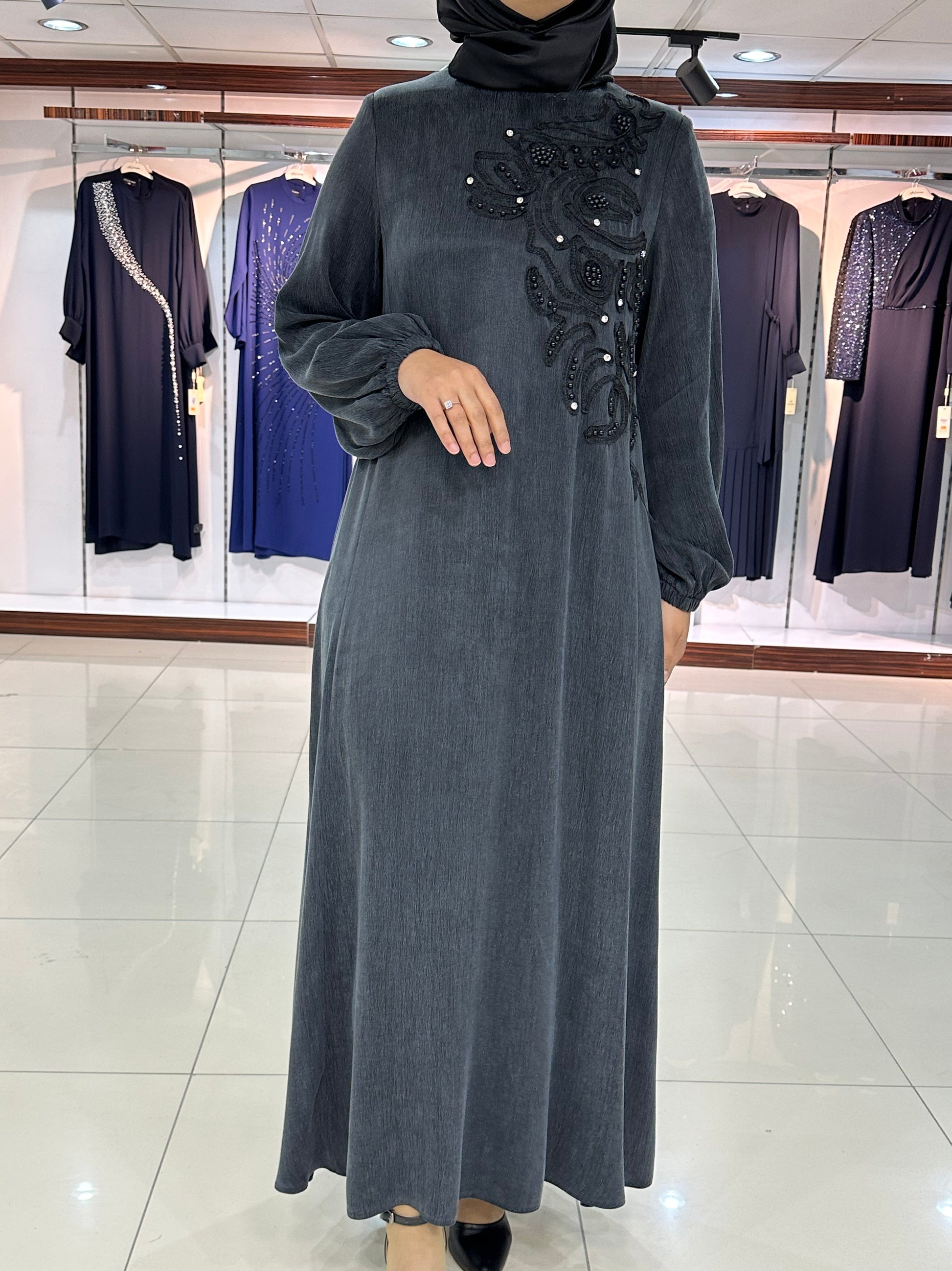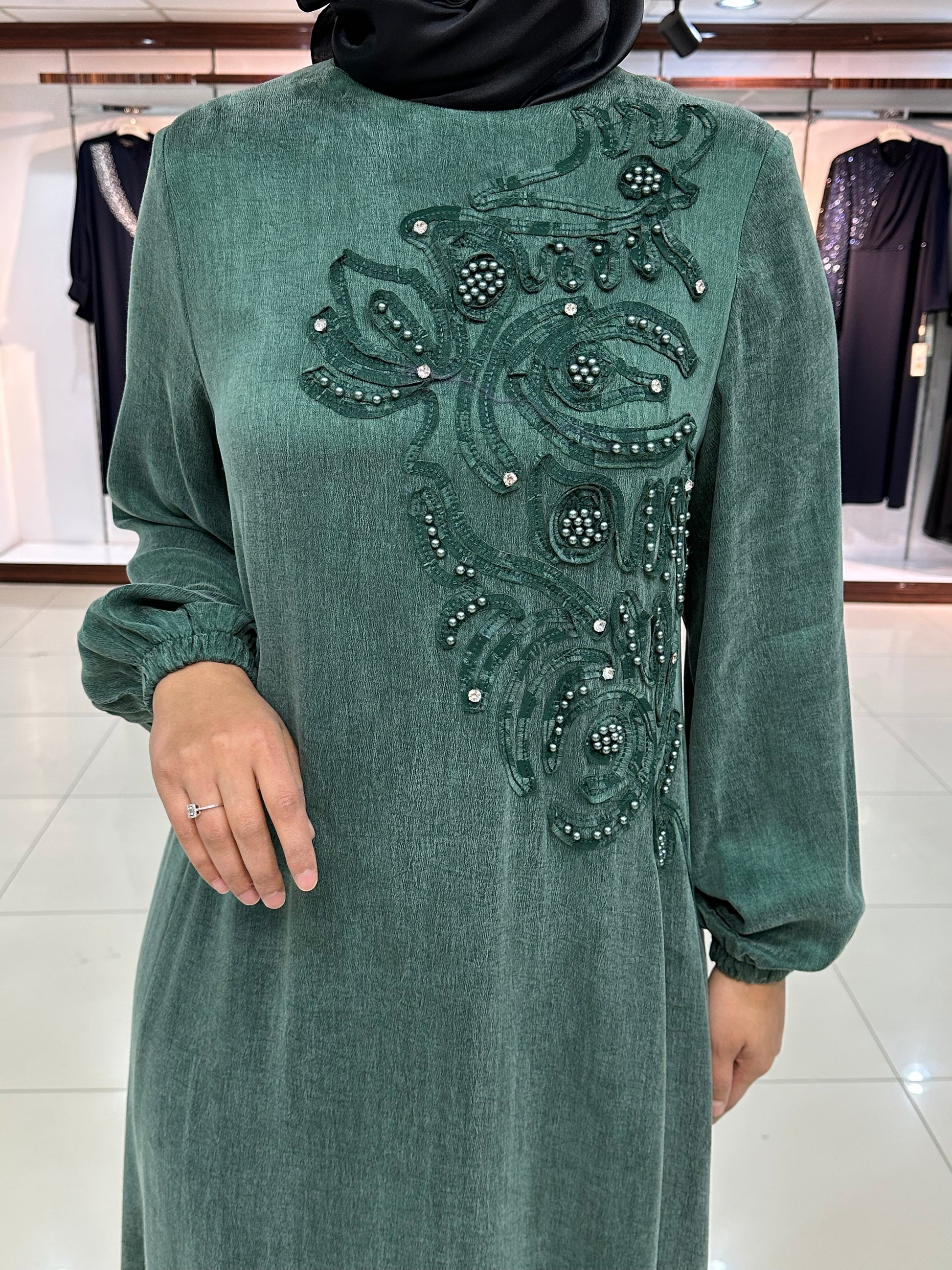Rahat kalıp, sırt yarım fermuar, kol ağızları lastikli, zımbalı boncuk işlemeli modelimizdir.