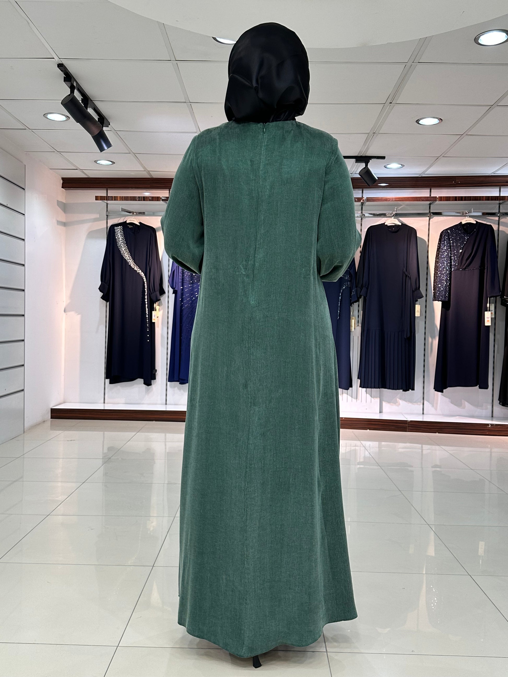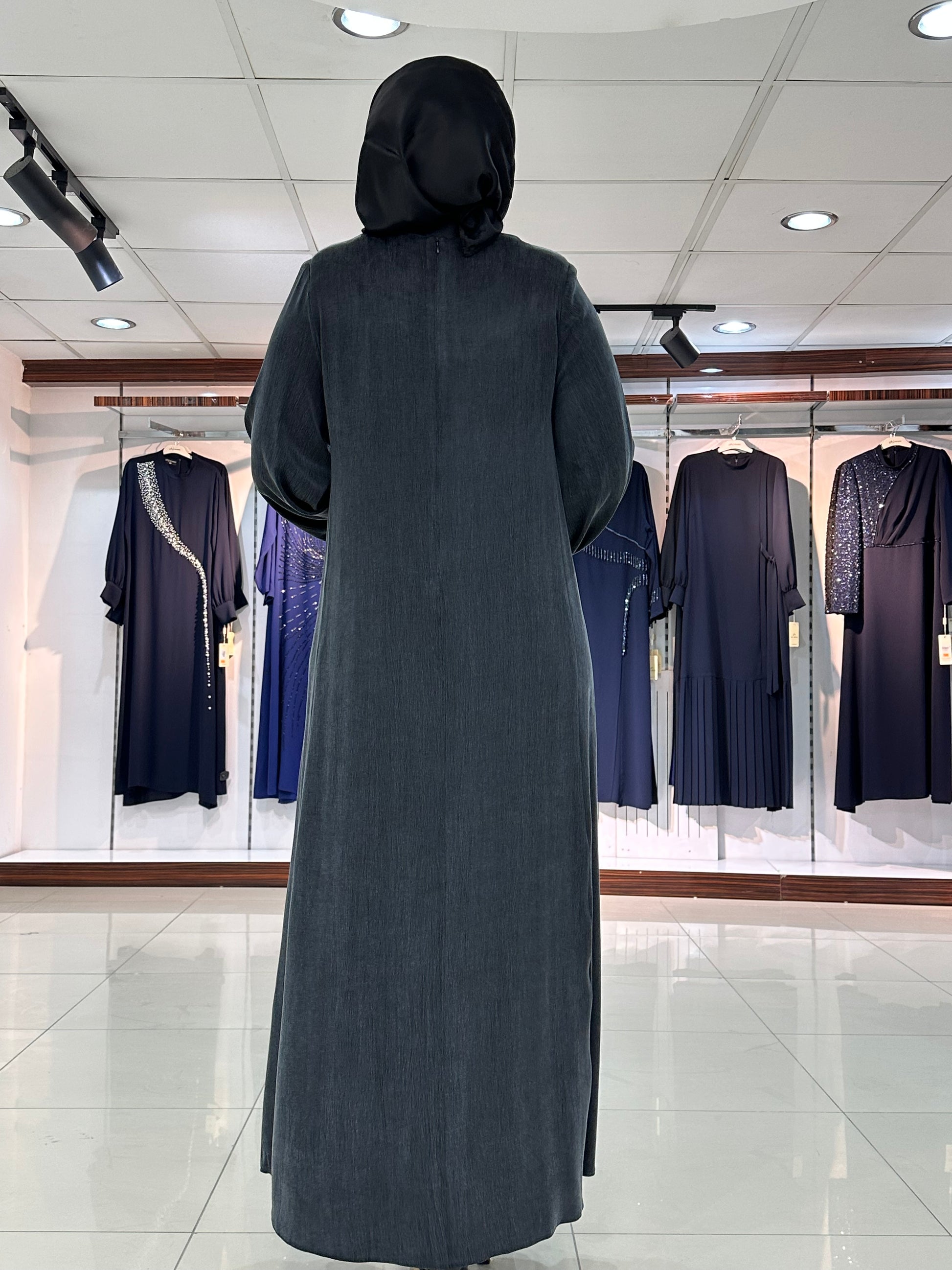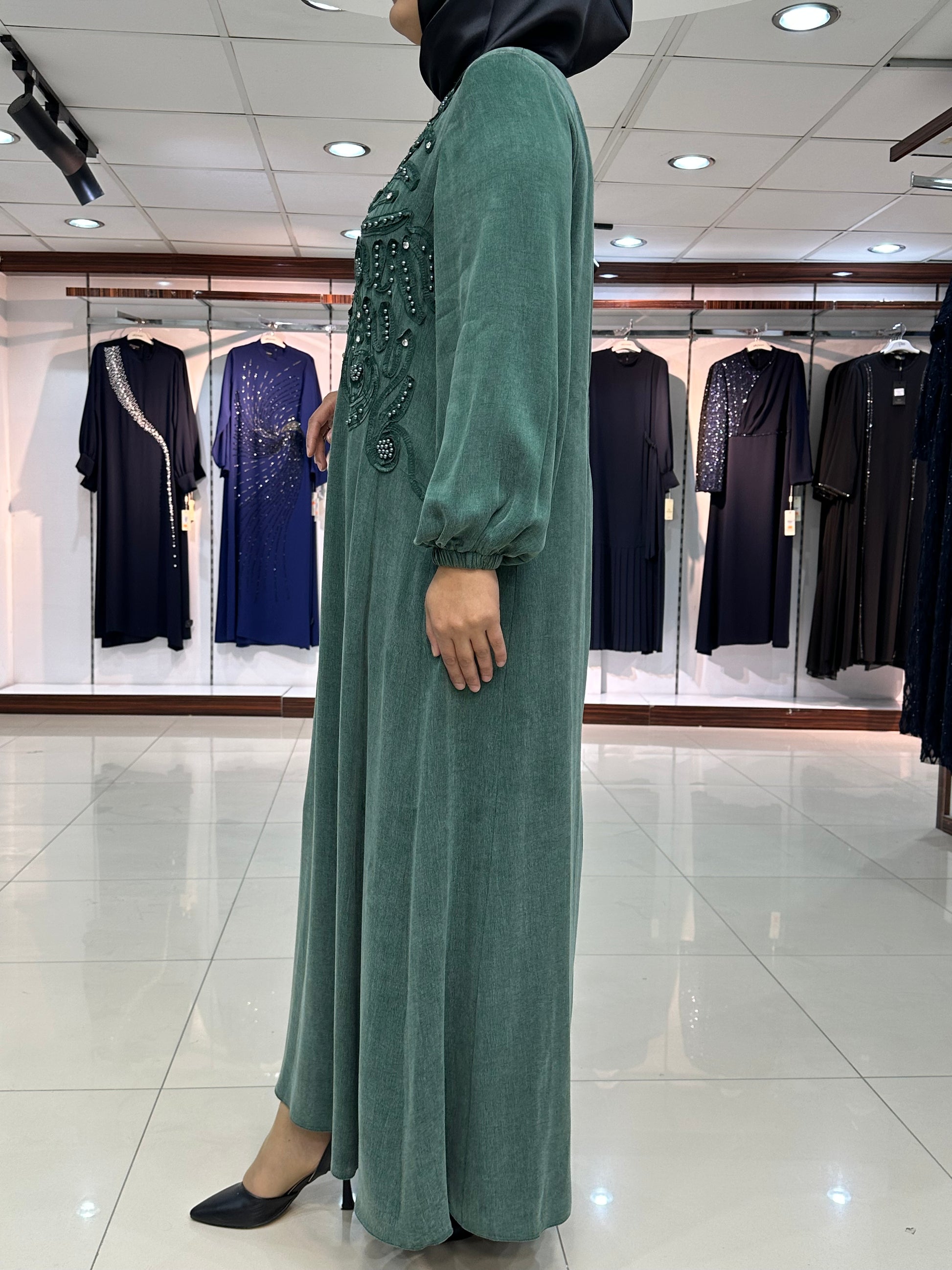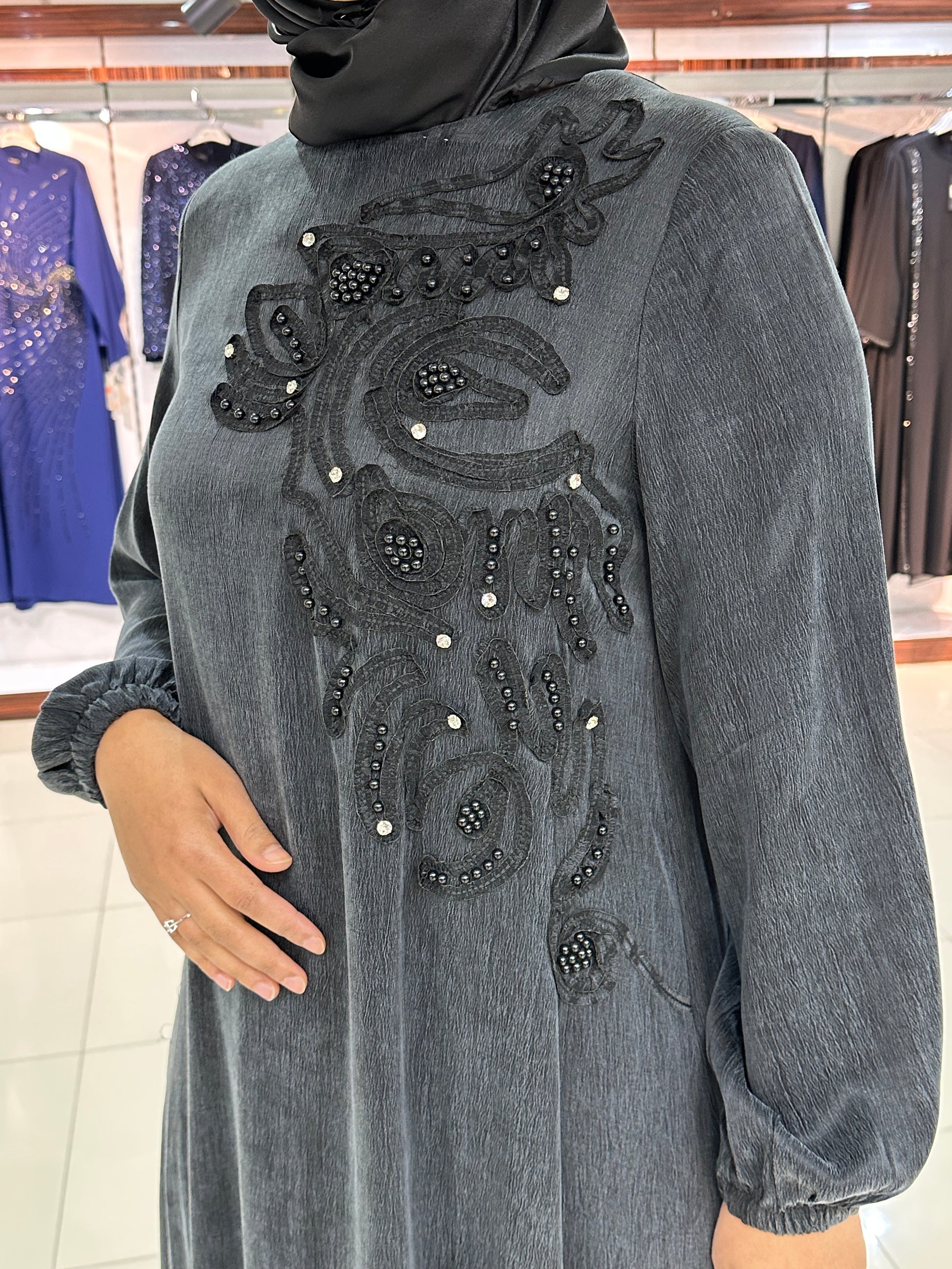 Rahat kalıp, sırt yarım fermuar, kol ağızları lastikli, zımbalı boncuk işlemeli modelimizdir.